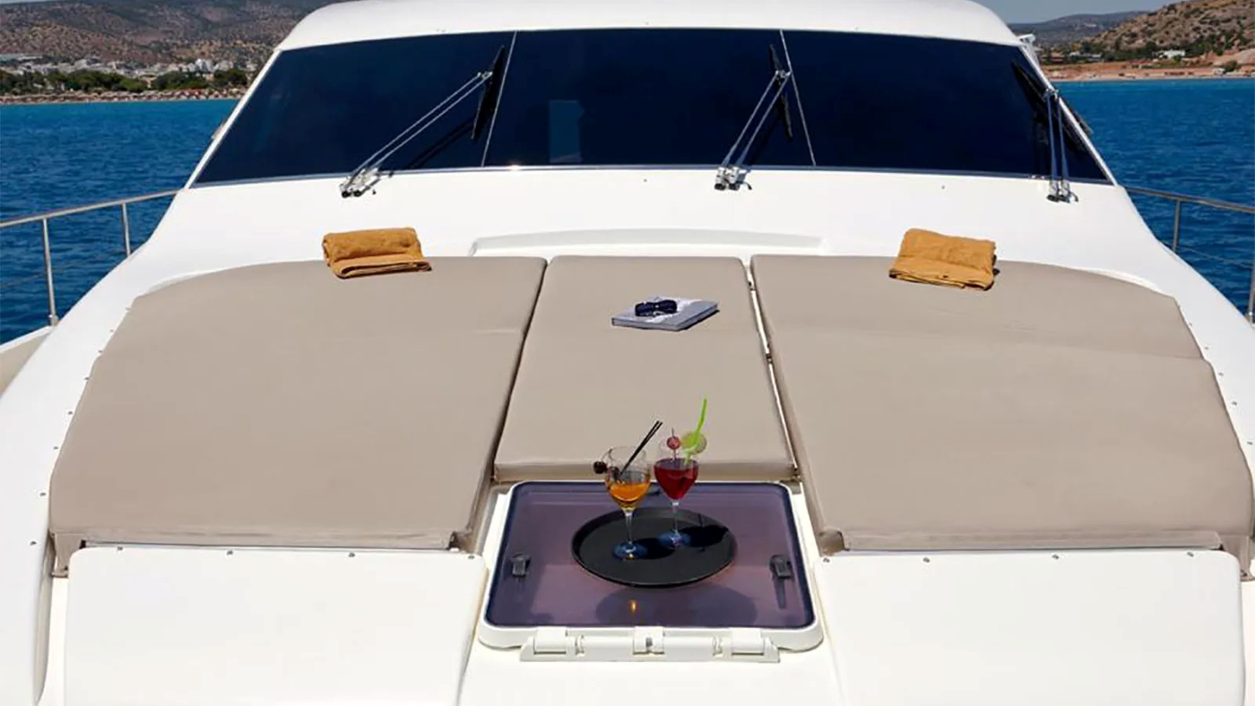 Covered sofa seating is placed along the stern and two stairways lead down to the swim platform for access to the tender and water toys.