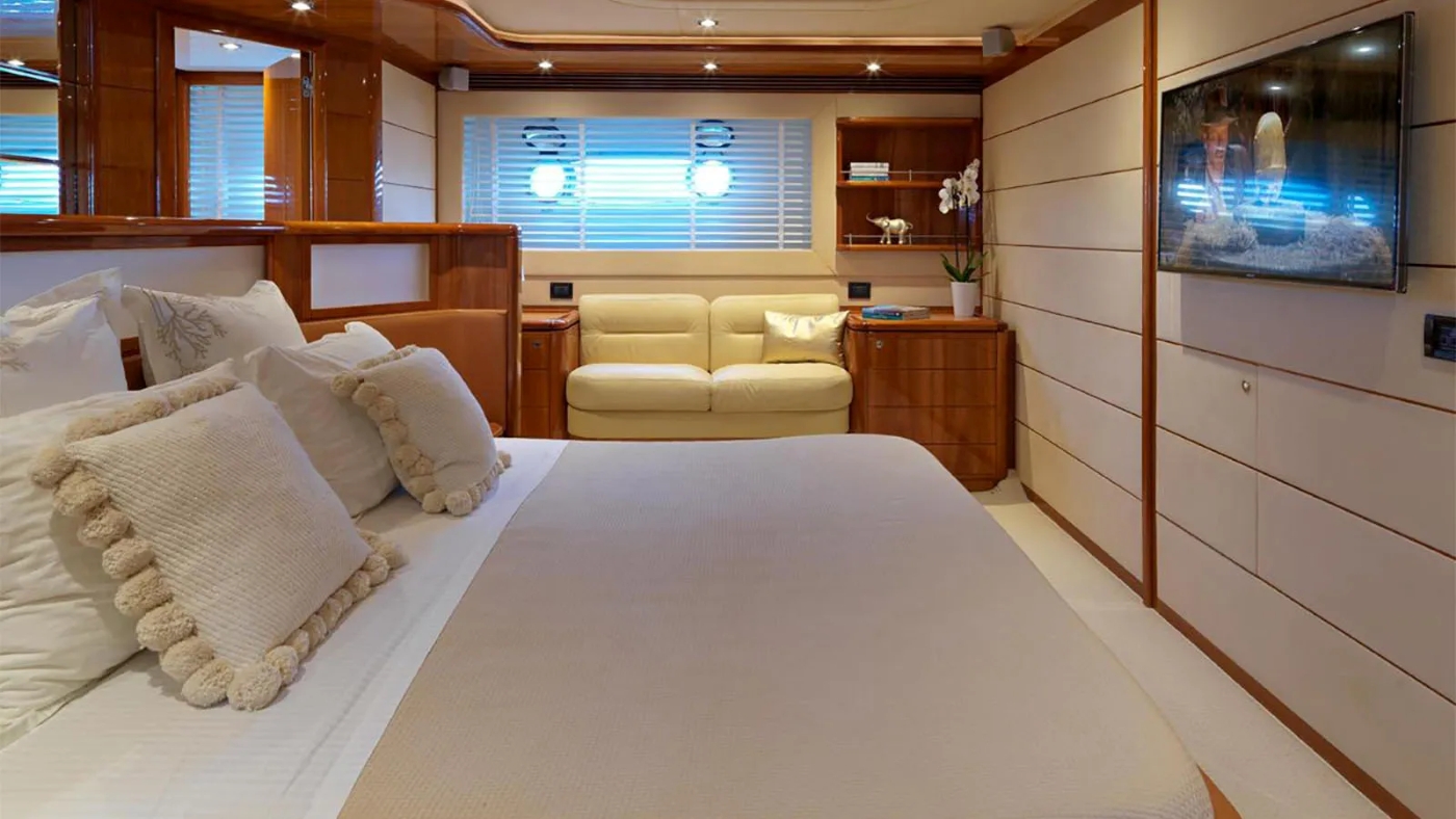 A stairway gives access to the flybridge forward, and behind the port, side salon provides two sofas and an armchair around a coffee table, with a widescreen TV on top of the starboard cabinetry.