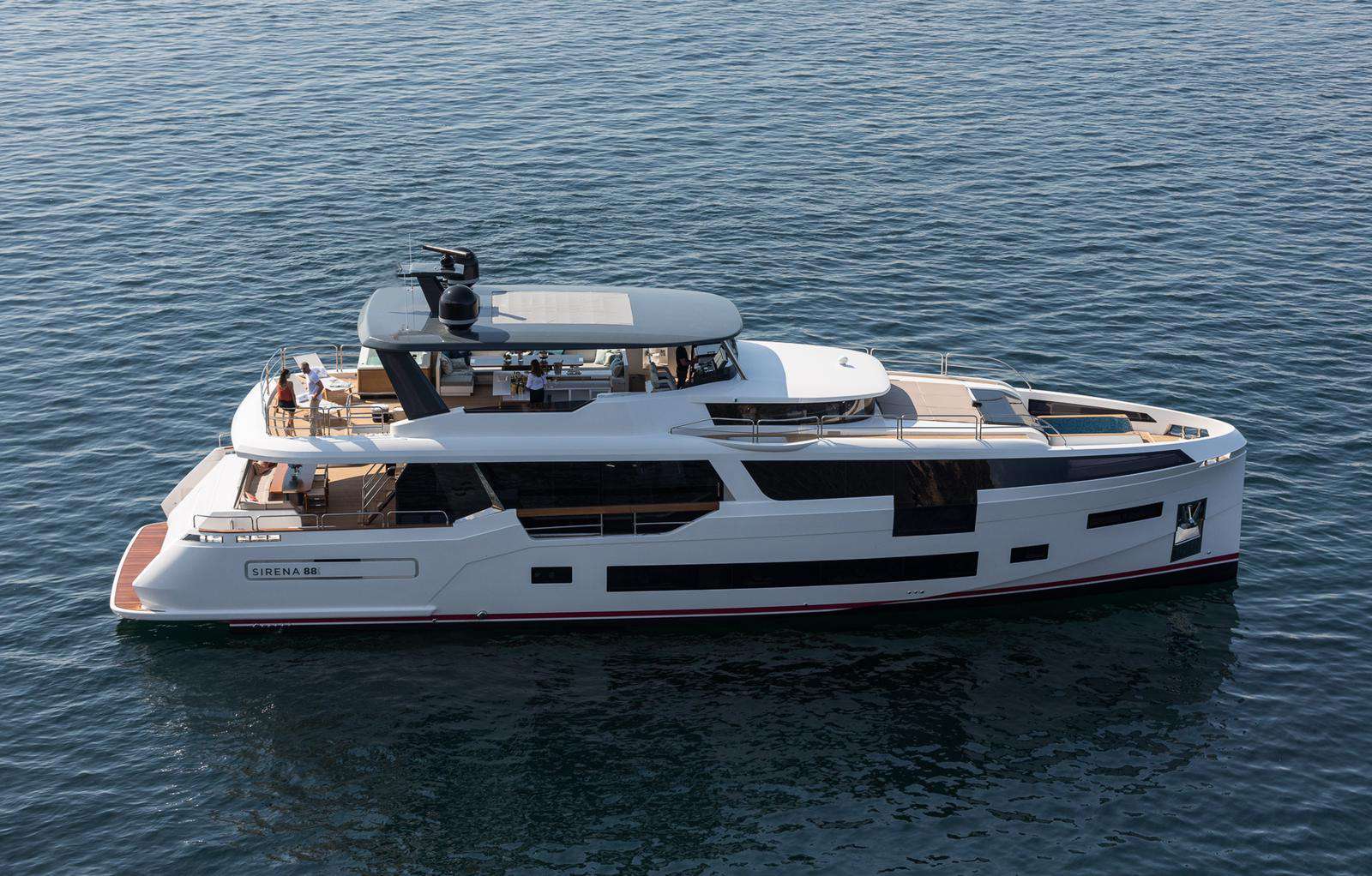 The wet bar is opposite and has four stools, and forward are the pilot and co-pilot seats and helm controls, with a stairway down to the interior centre. The amidships section is shaded by the roof, which can be opened at the ...