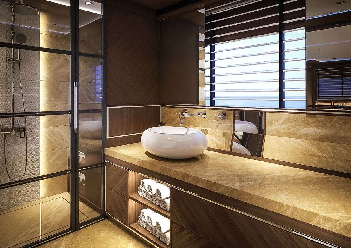 The forward en-suite bathroom has two sinks, a toilet and a double shower, and there is also access to the private foredeck.