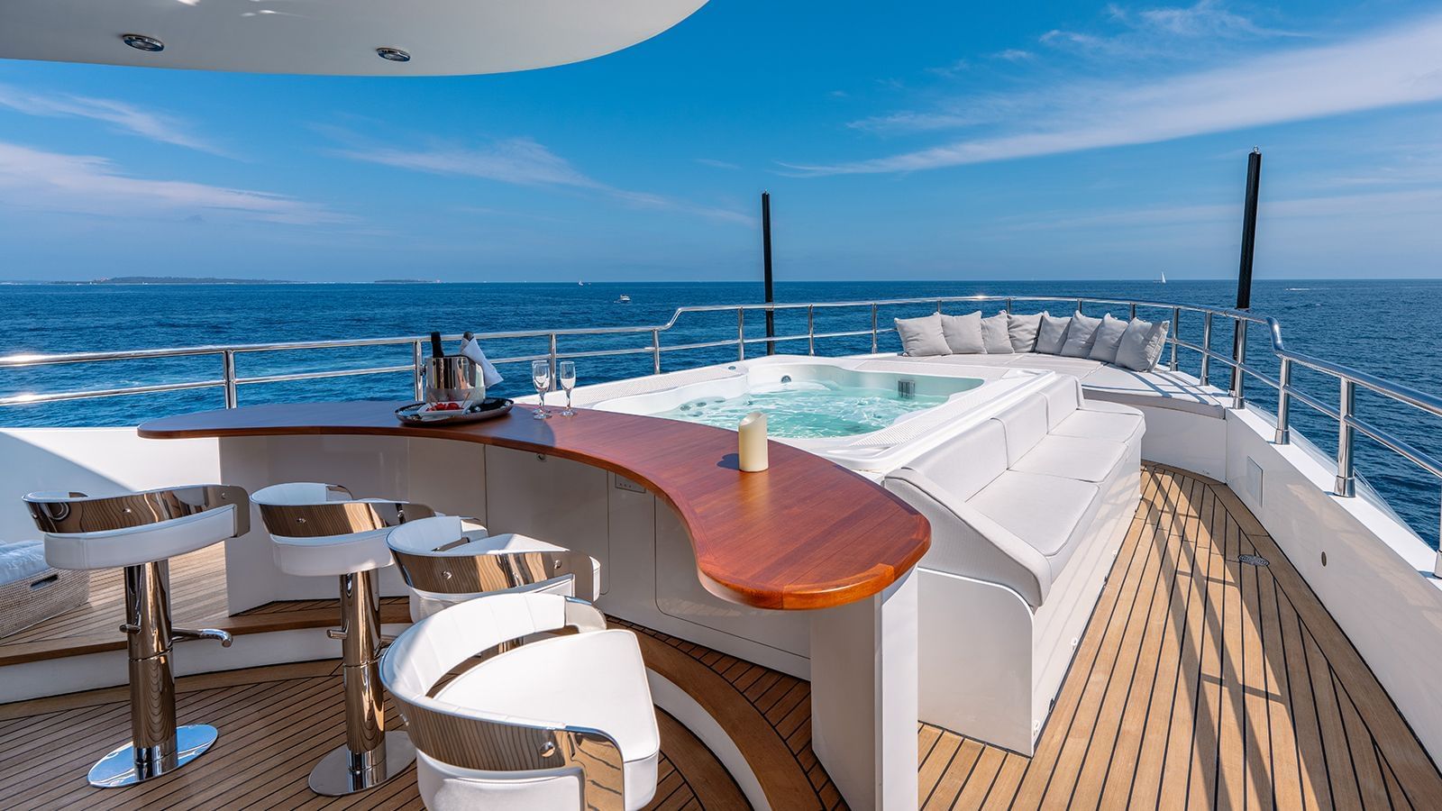 The main saloon, with a rich wood finish, hand-knotted silk carpets, exquisite seating finished with the softest leather and silks creates the feel of a luxuriously appointed home.