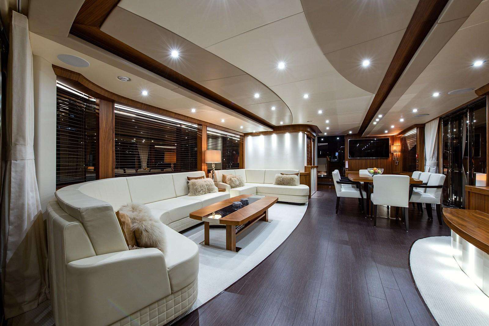 Farther forward, the helm controls are placed to port and a corner sofa and sunbed opposite. The sunroof has an automated section which folds back to let the sunlight stream down.