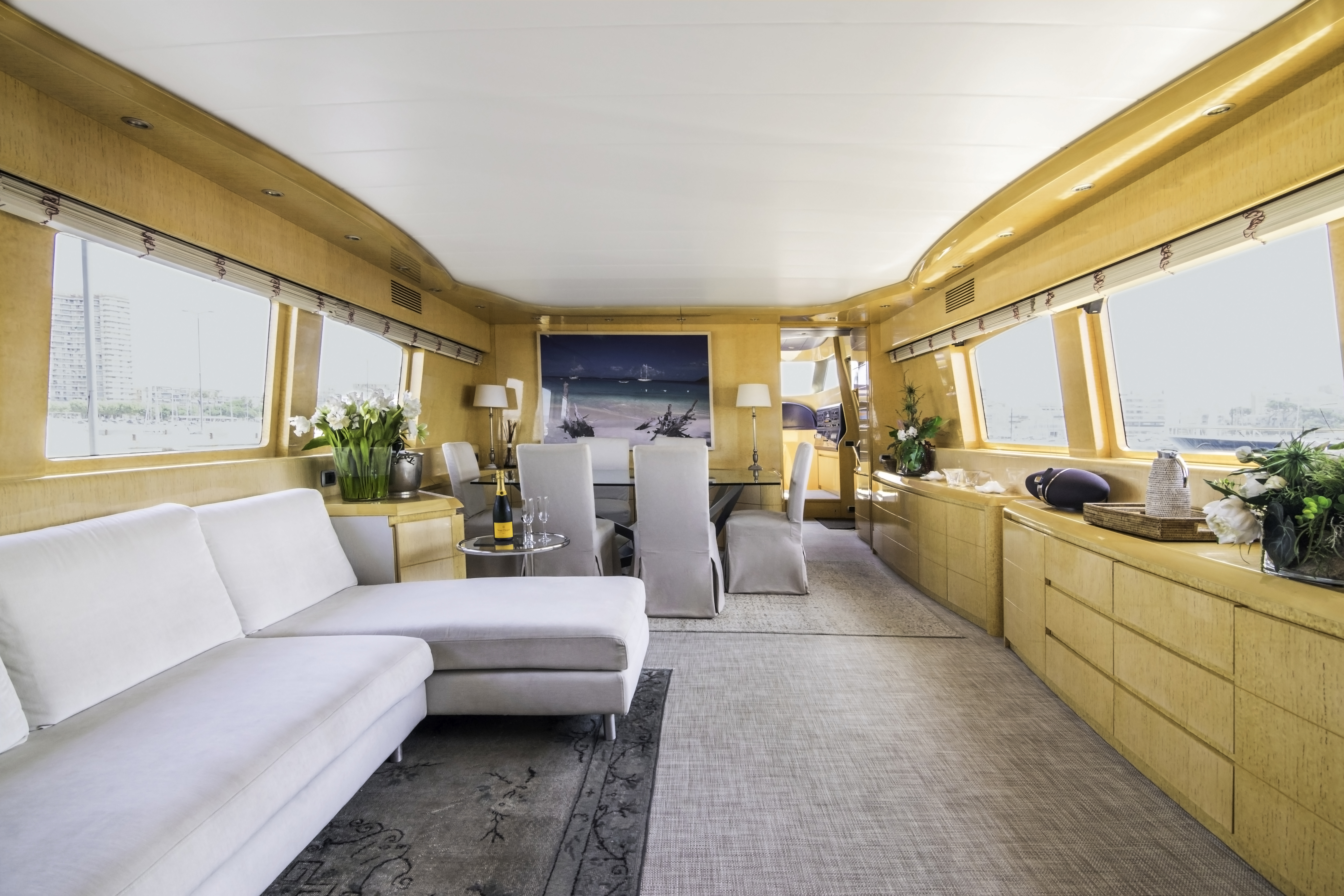 The port side is fitted with a plush C-shaped sofa and elevated table, while an equally soft navy sunbed is placed in the sunshine along the stern.