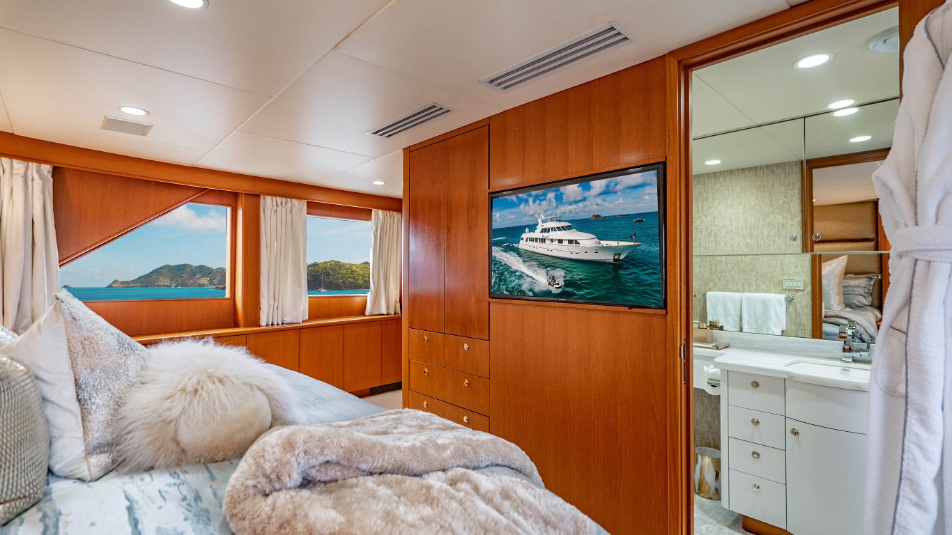 The main salon provides two plush sofas around a coffee table to port, with two armchairs and a side table to starboard with a widescreen TV for entertainment throughout the cruise.