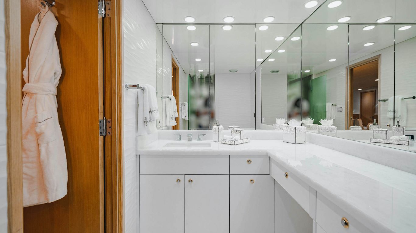The skylounge behind provides another curving corner sofa and coffee table forward to port with two armchairs and a side table behind. Opposite, a drinks/games table for four is placed next to the starboard windows, and a ...