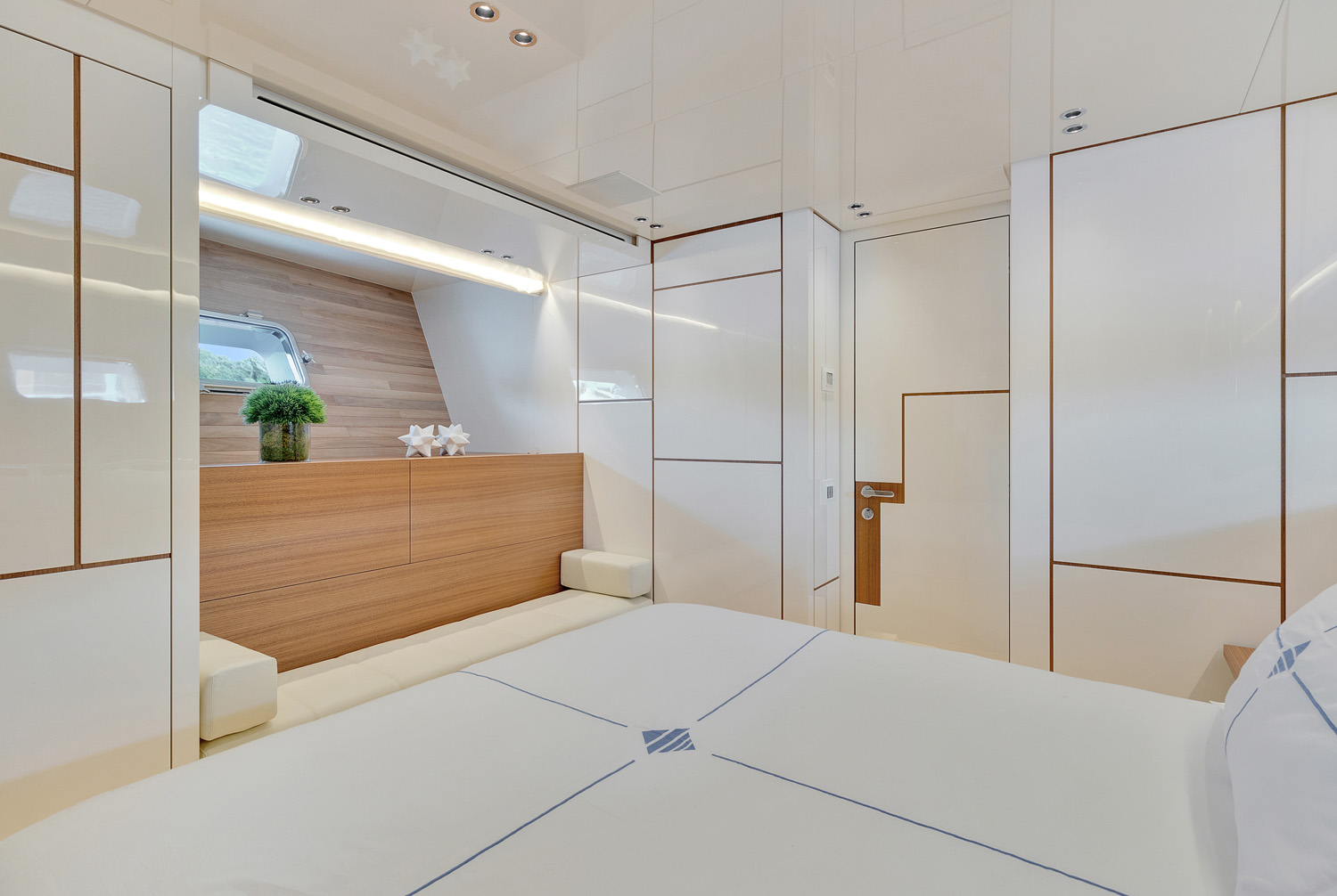 Her modern, open and airy design offers accommodation for up to 8 guests in 4 cabins, with additional accommodation for a permanent crew of 3.