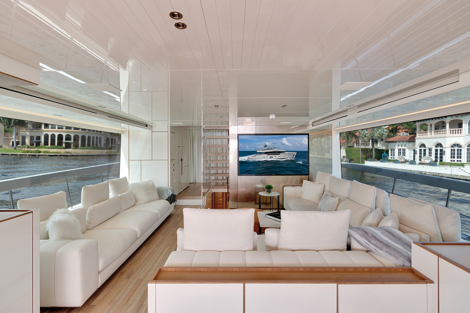 Two stairways lead down to the lower deck, where a sofa looks out over the stern and the submersible swim platform provides easy access in and out of the water.