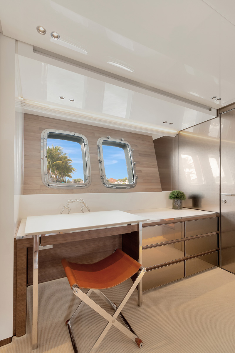 Two stairways lead down to the lower deck, where a sofa looks out over the stern and the submersible swim platform provides easy access in and out of the water.