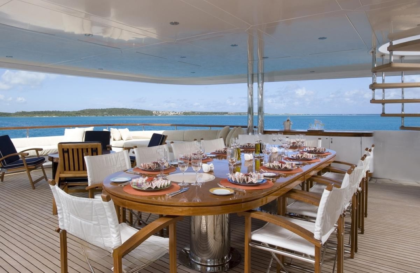 The sundeck on Motor Yacht ODESSA is one of the highlights of this design with a very spacious sunning area, several dining options, shaded areas, a Spa Pool and plenty of sunpads.