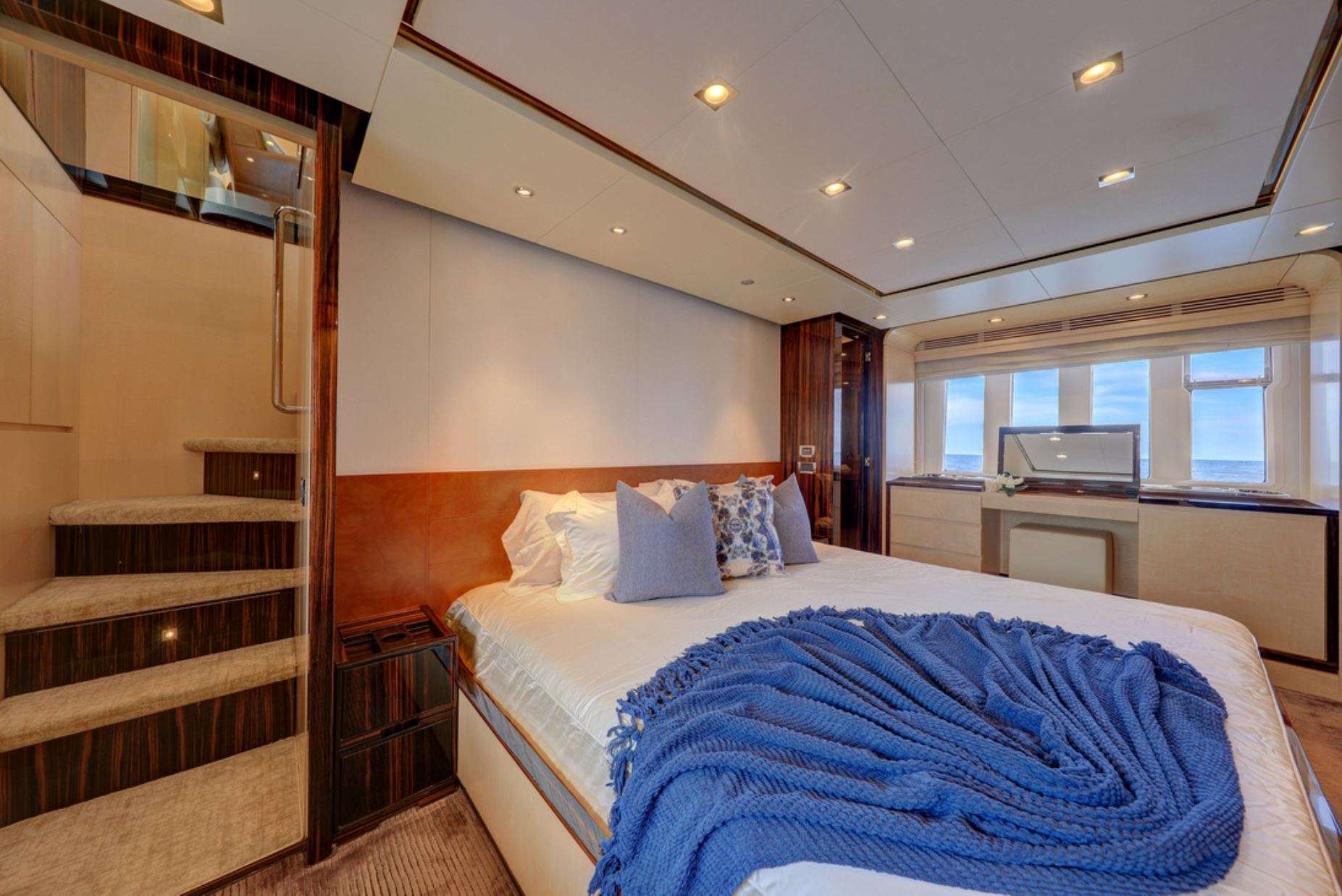 Behind to starboard is the galley, which joins into the salon and provides bar seating. A wine cabinet is to port along with a circular table to seat six diners in an intimate atmosphere with great views. A widescreen TV is mounted on the forward wall beside the bar, and behind is the stairway down to the guest accommodation.
