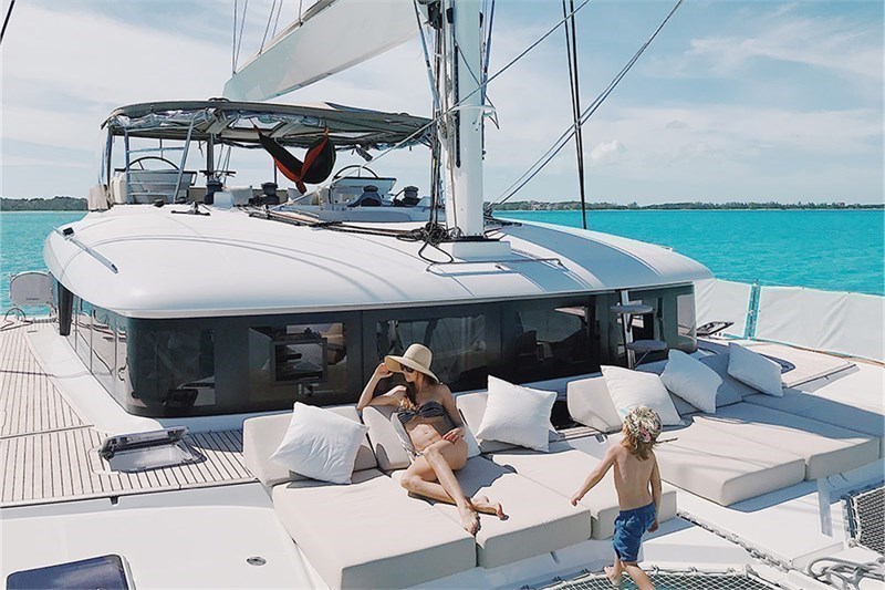 A sofa lines the stern, and two stairways lead down to the lower deck swim platform for easy access to the water.