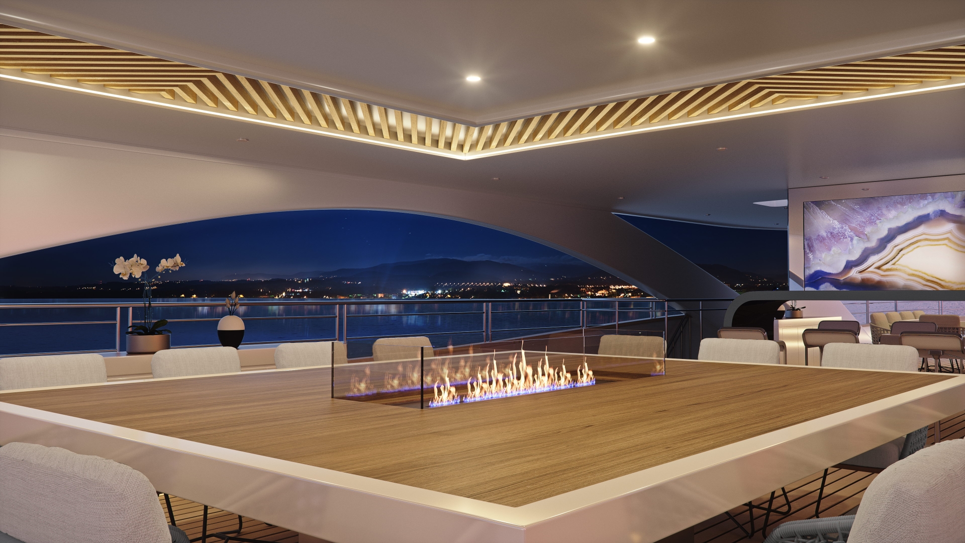 The upper deck is the main alfresco social area and provides sofa seating on both sides that curves with the bulwarks, plenty of drinks tables and plush armchairs to complete the serene setting.