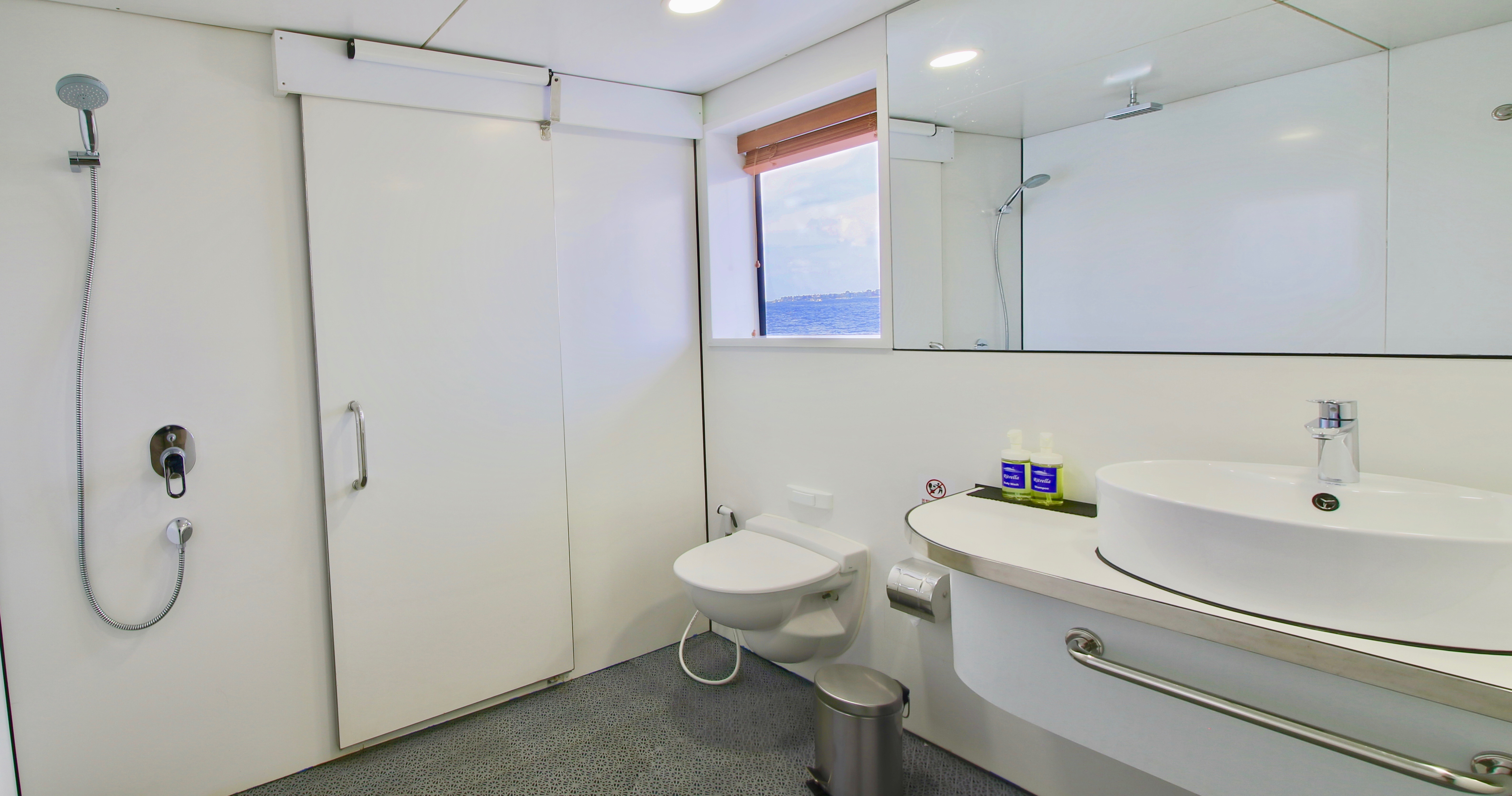 ~ The 3 deluxe suites on the upper deck measure 16m2/172ft2 and each have a king-sized bed, sofa, flat-screen TV, closet, mirror and mini bar. The en-suite bathroom has a sink, toilet and shower.