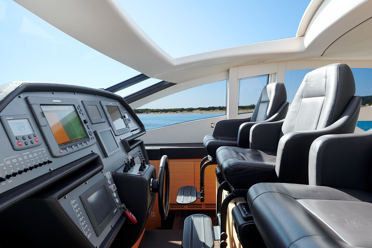 A staircase leads to the main deck, where the helm controls are forward, behind which is a light-filled lounge featuring a dining area and lounge with a 42" widescreen TV.