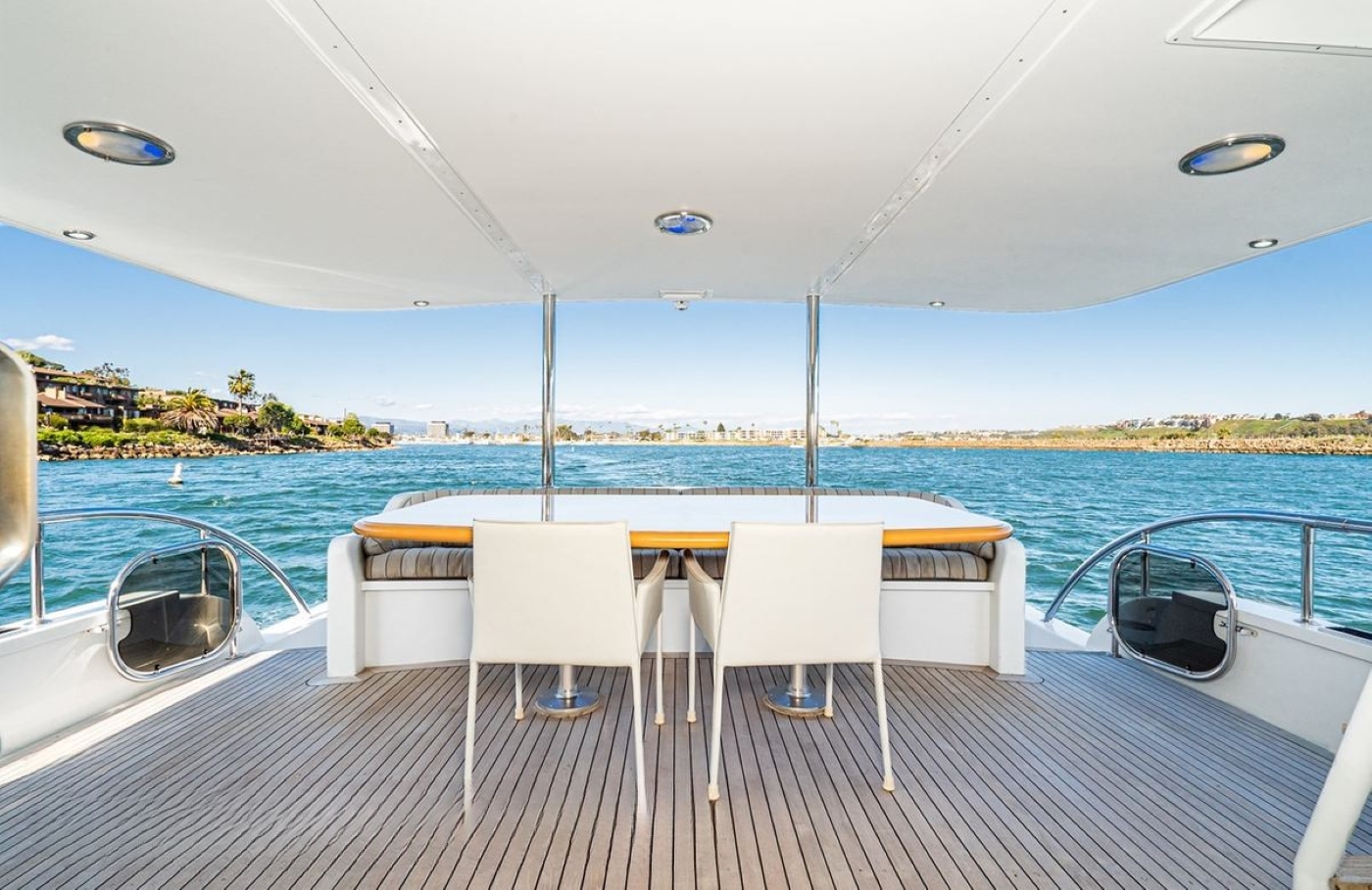 The spacious flybridge offers guests a selection of seating perfect for taking in the far-reaching views.
