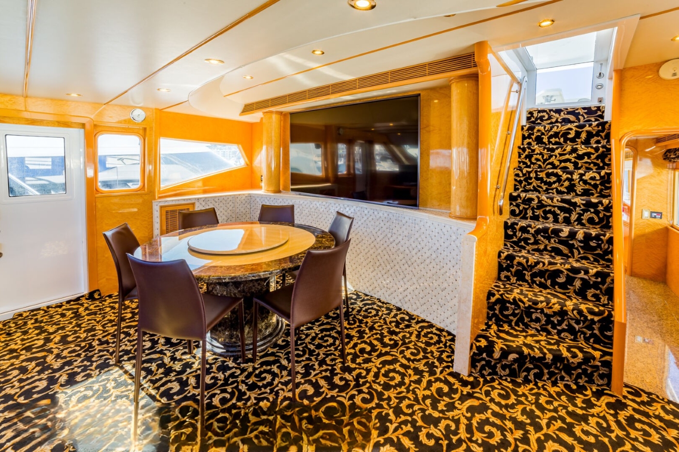 On the sociable main deck aft there is a delightful al fresco dining setting for guests to enjoy lunch in the sunshine or dinner under the stars. Steps lead down to the swim/fishing platform which can be extended further with the inflatable platform.
