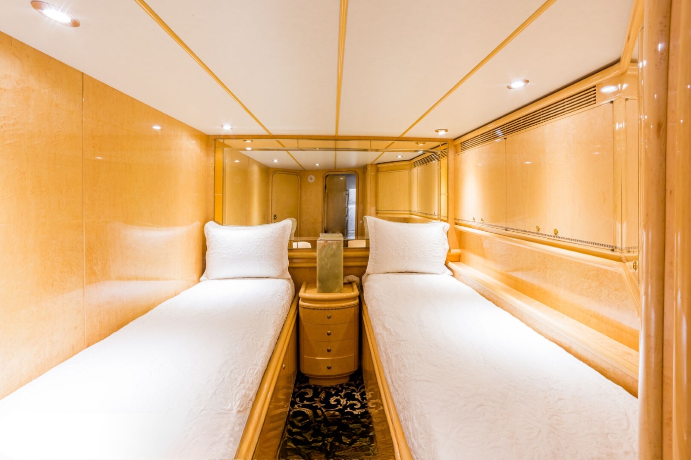 A four-cabin layout can accommodate up to eight guests in a master, VIP and two twin suites. The master boasts a deluxe ensuite with double sinks and spa bath, while the guest suites are comfortable and welcoming with ensuite bathroom facilities.