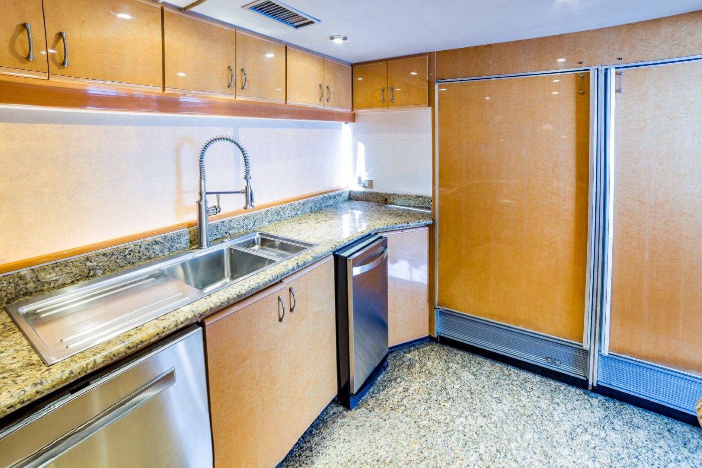 The décor blends Birds Eye Maple wood panelling with light wood floors and sumptuous soft furnishings.