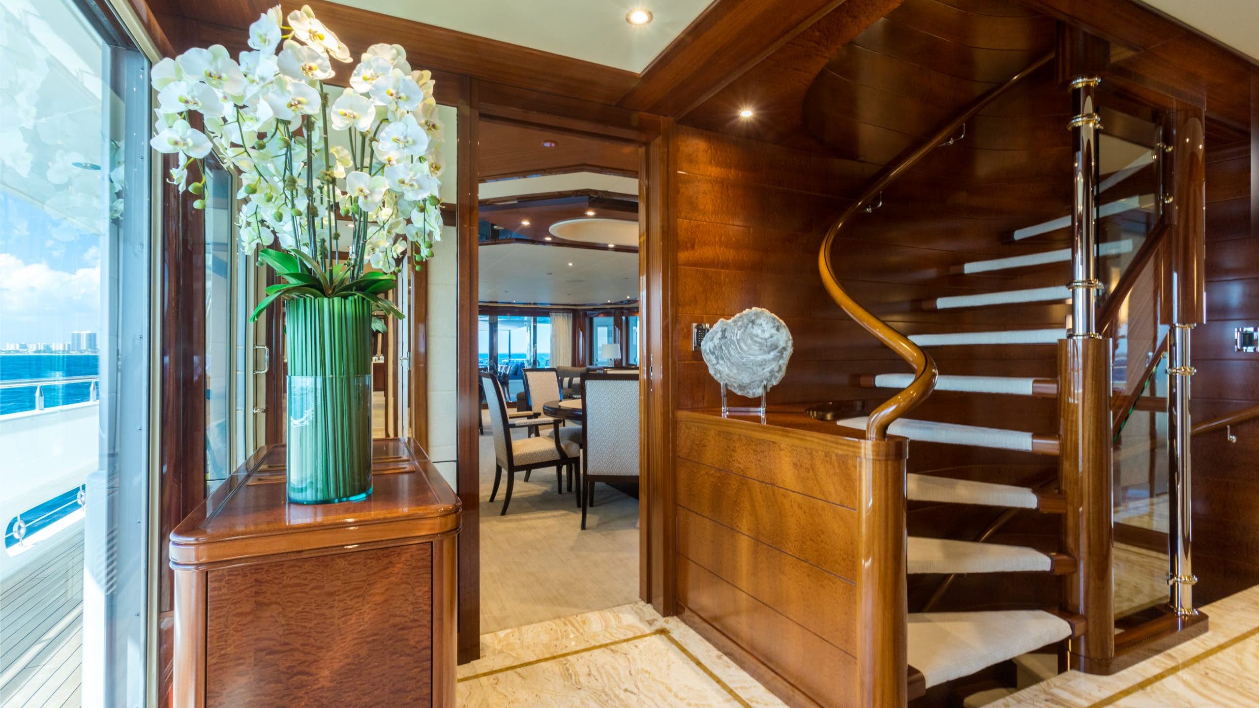 The main deck aft also has a starboard stairway up to the bridge deck aft, and side walkways lead past the main lounge to stairs up to the foredeck.