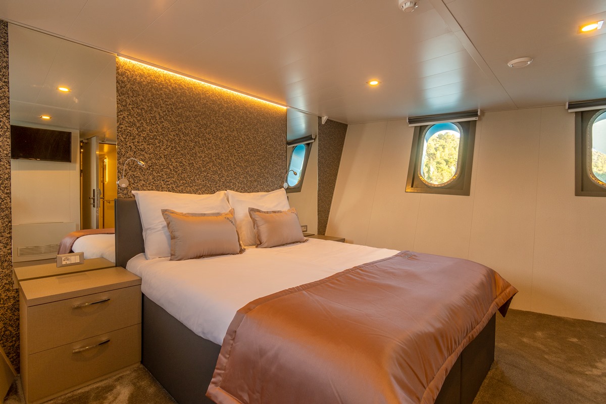 She was custom-built in 2021 and offers large on deck spaces with elegant and welcoming decor and deluxe accommodation in 14 cabins for up to 30 guests. A professional and highly skilled crew of 8 offers exceptional service at all times.