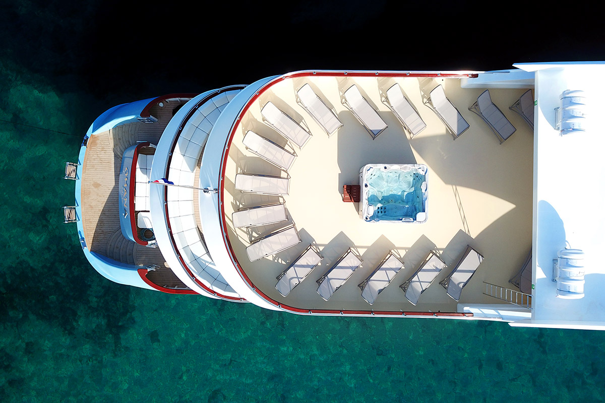 She was custom-built in 2021 and offers large on deck spaces with elegant and welcoming decor and deluxe accommodation in 14 cabins for up to 30 guests. A professional and highly skilled crew of 8 offers exceptional service at all times.