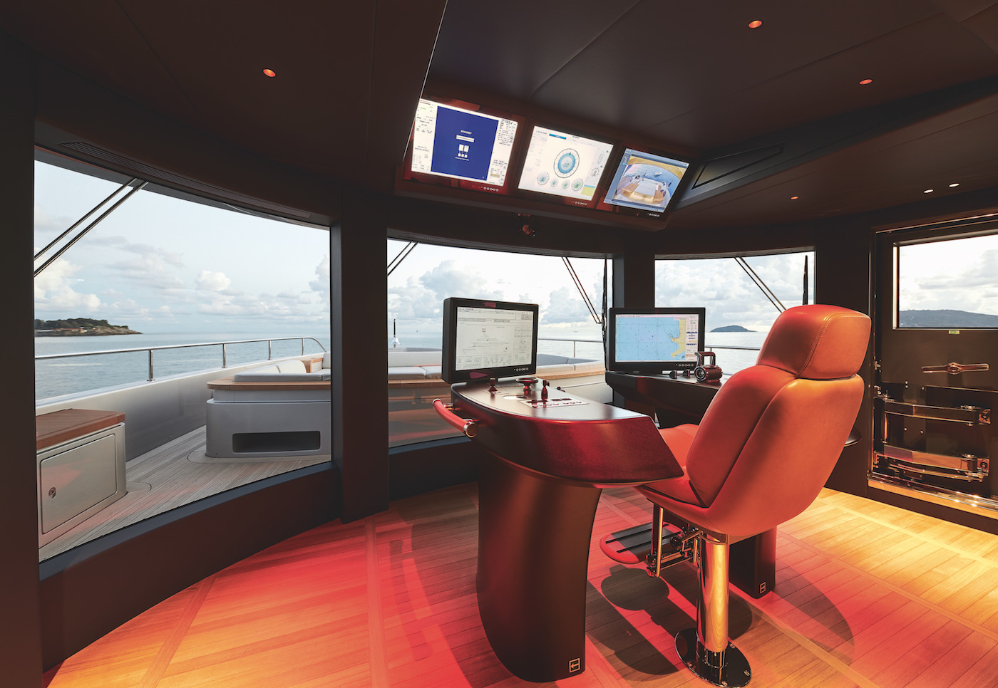 Above, the helm station has a corner sofa and table to port for close conversation over drinks or a quiet place to spend time on personal interests.