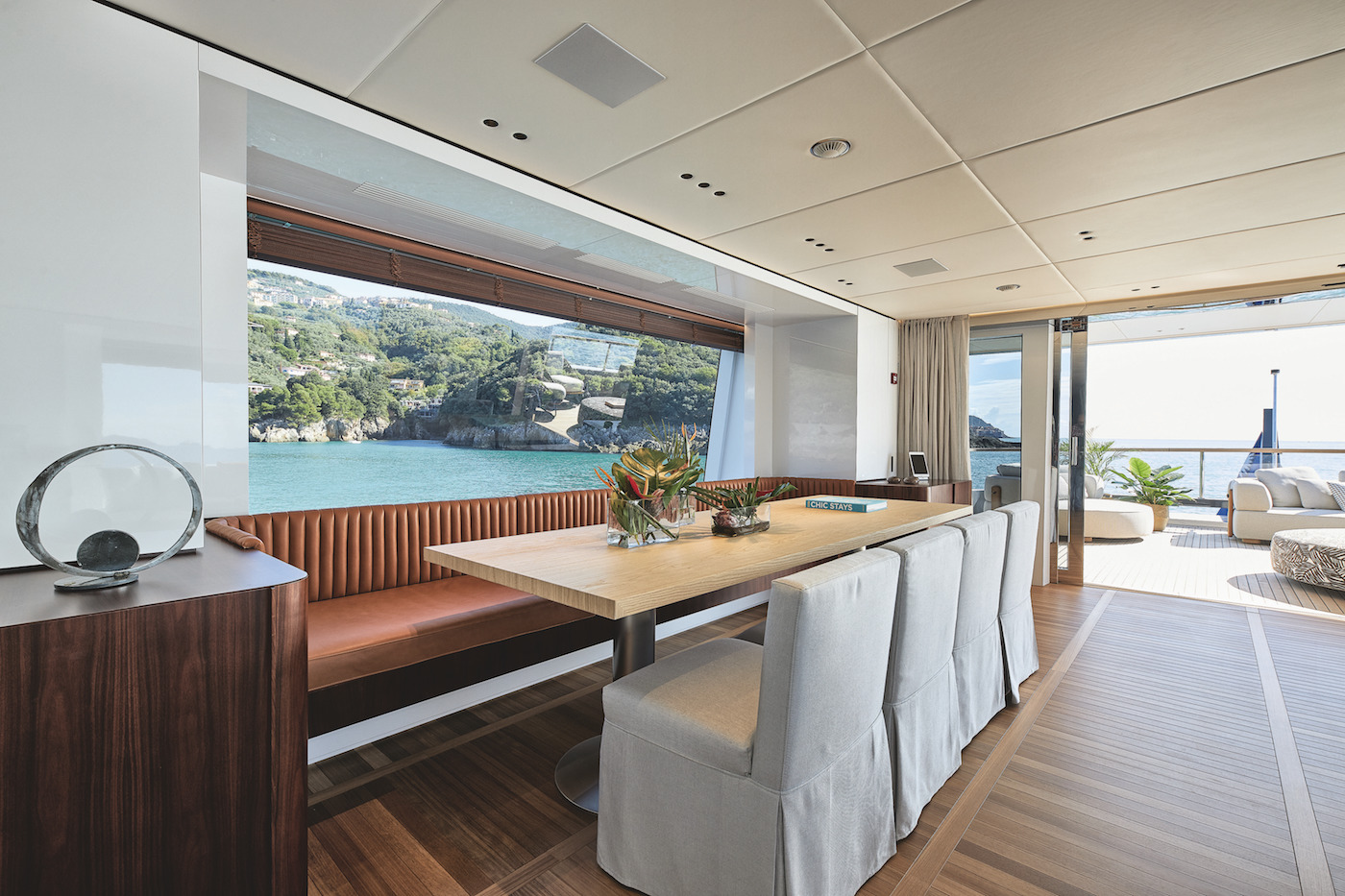 A starboard side walkway leads past the main salon to the stairs up to the foredeck, where there is a C-shaped sofa, two drinks tables and a broad sunbed where guests can enjoy sweeping views.