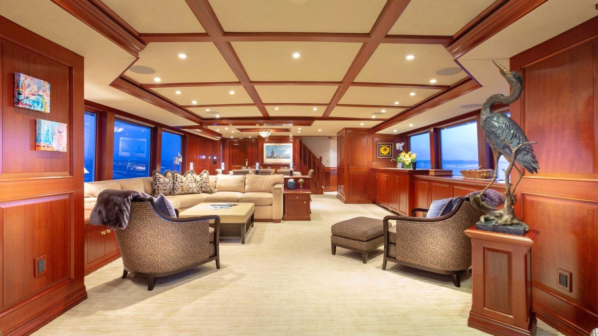The amidships section hosts a wet bar to port with a barbeque bar opposite, and along the stern there is a Jacuzzi and sunbed to unwind, day or night.