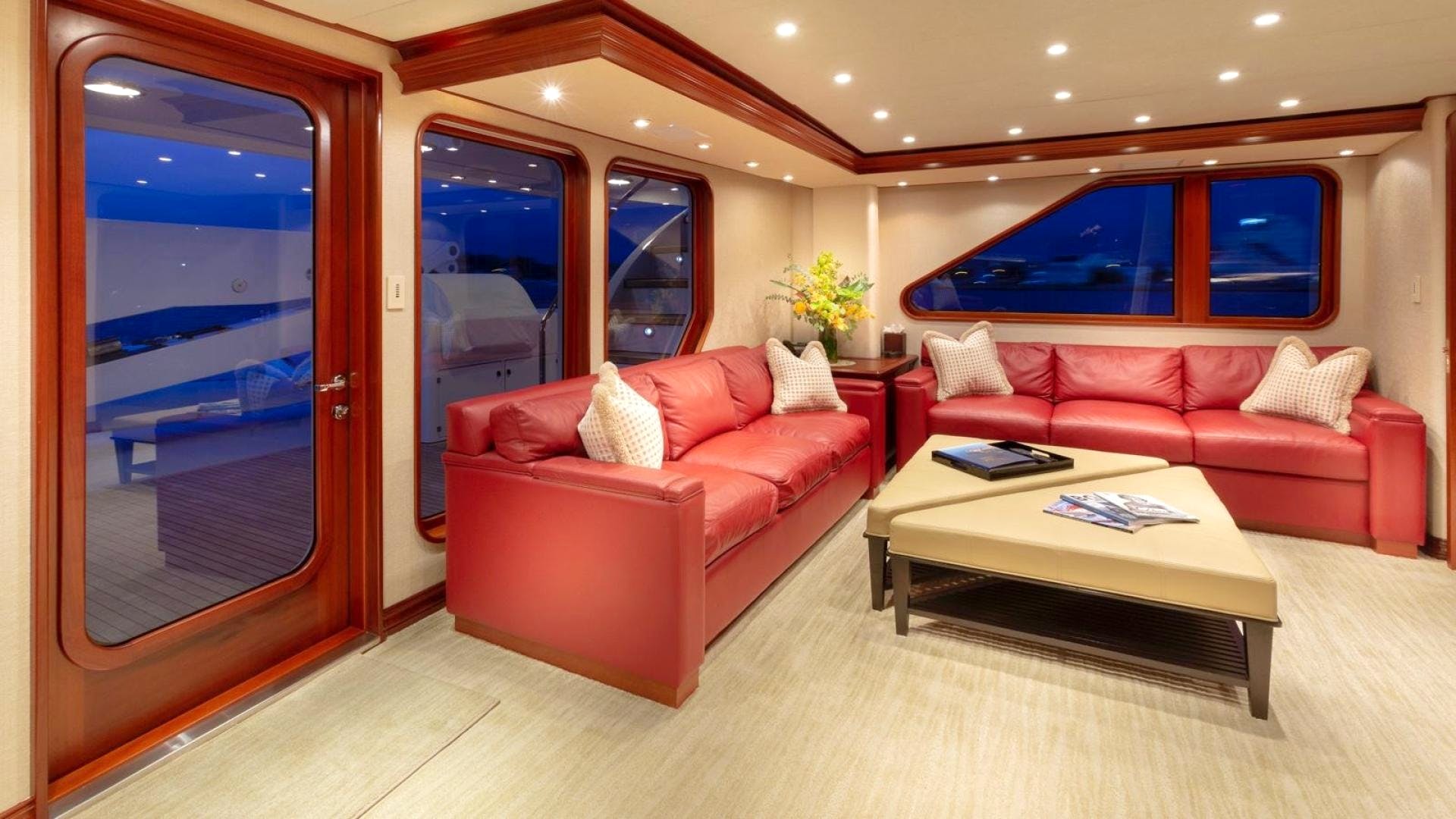 The salon offers a corner sofa to port with a covered coffee table plus an armchair in each aft corner.