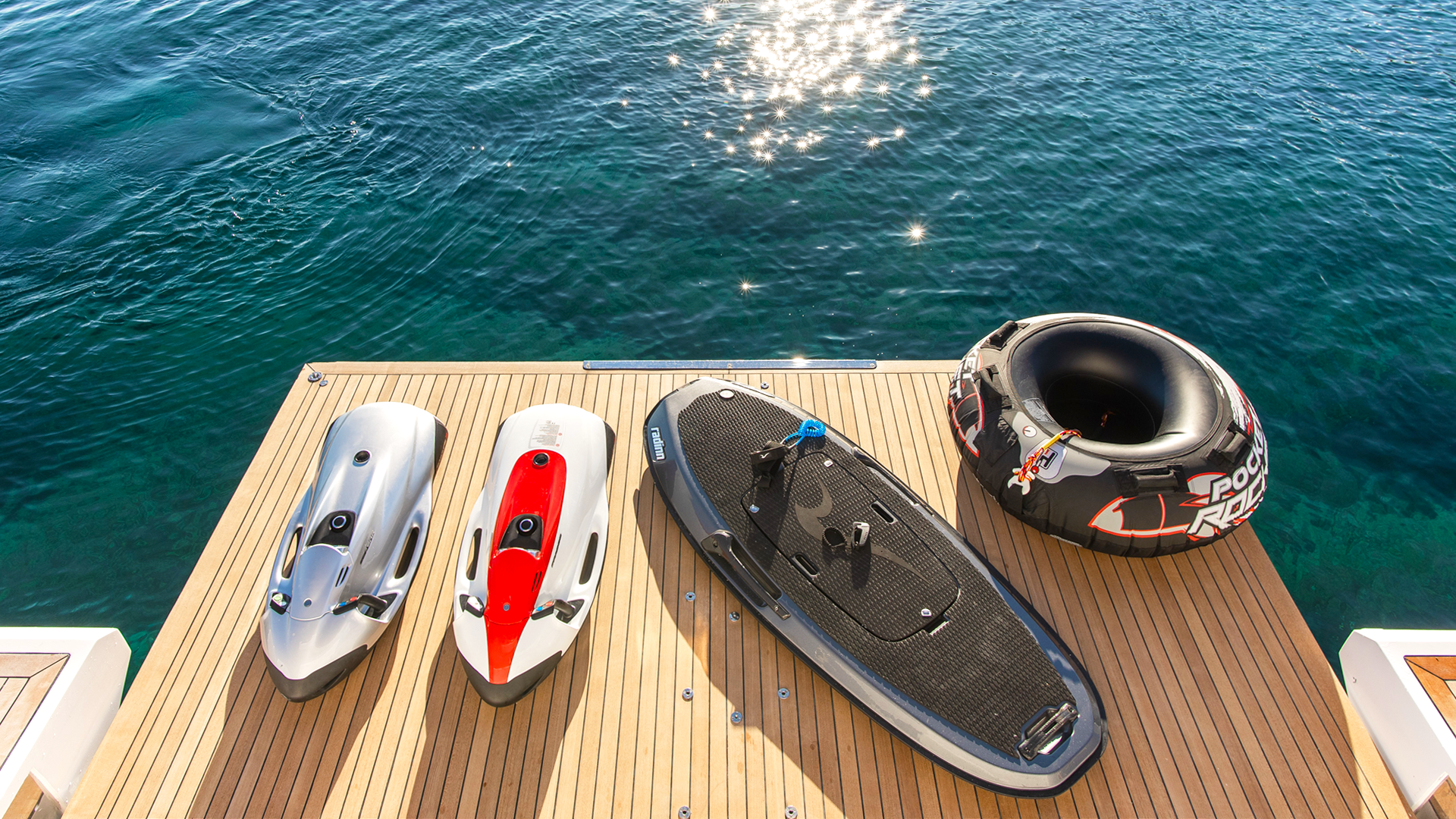 NOTABLE FEATURES OF DAWO: ~Beautiful contemporary interiors ~Flybridge wet bar ~Spacious guest cabins ~Great selection of water toys ~Maximum speed of 28 knots ~Draft of just 1.9m/6.4ft for close beach access ~Air conditioning ...