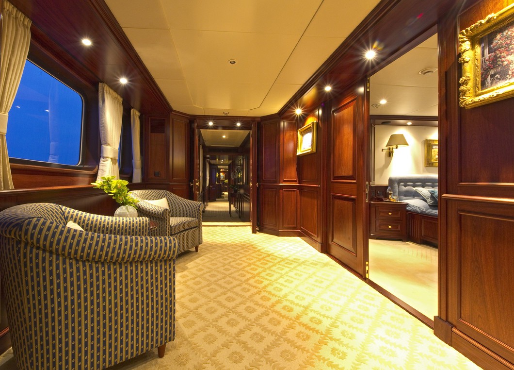 The elegant and large dining area with oval mahogany table comfortably seats twelve. Adjacent to the dining area is the main saloon which is furnished in pale fabrics, contrasting attractively with the dark wood detail. The large aft deck has an ample dining area.