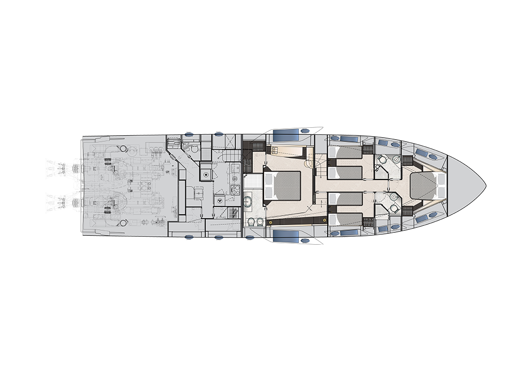 The accommodation sleeps up to eight charter guests across four en-suite cabins, with a crew of six for stellar service throughout the journey.