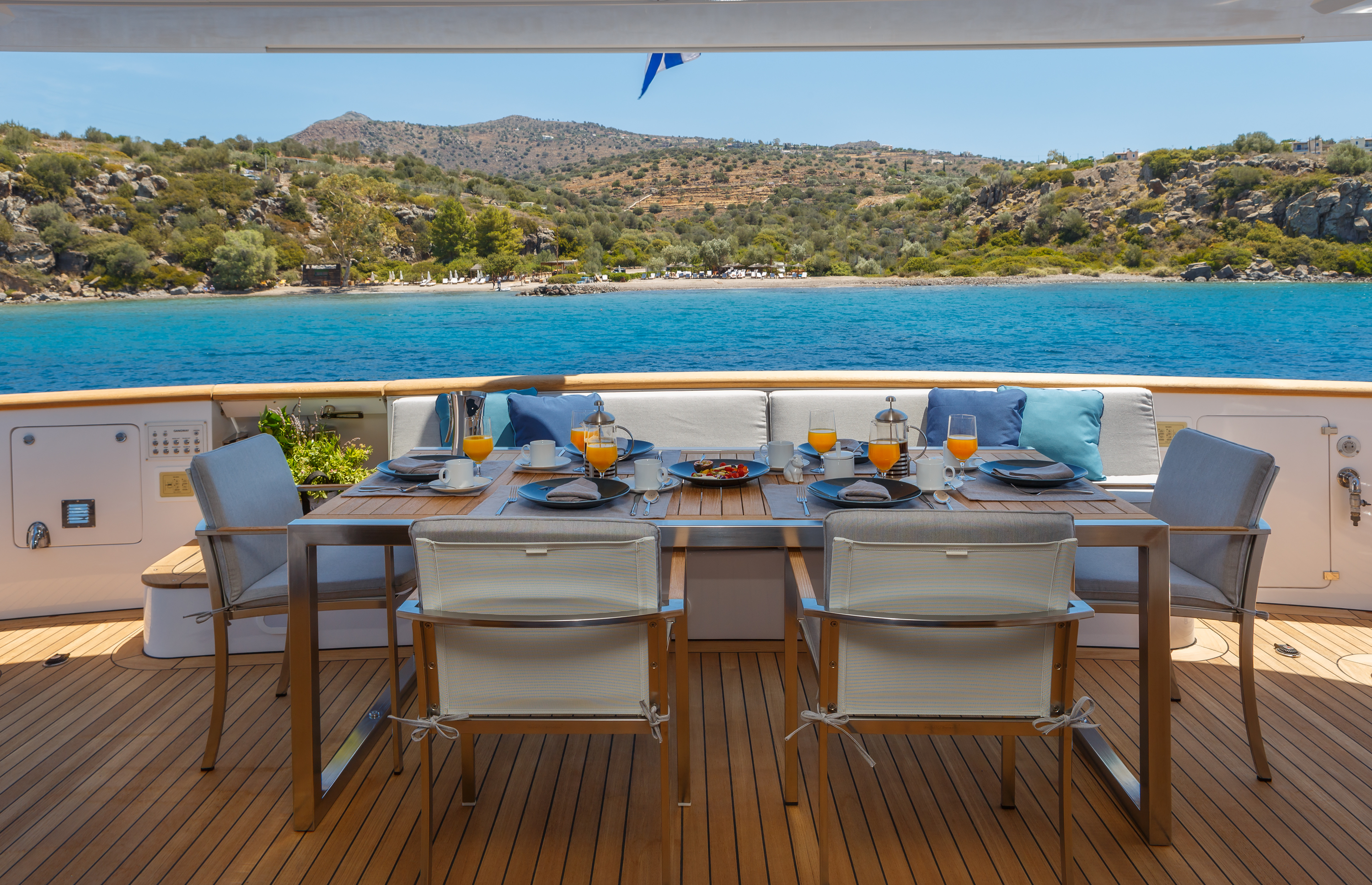 Alfresco dining can be enjoyed forward of the living area, where there is a dining area with seating for all eight guests. This spacious relaxation area is completed with an open-air barbecue and bar.