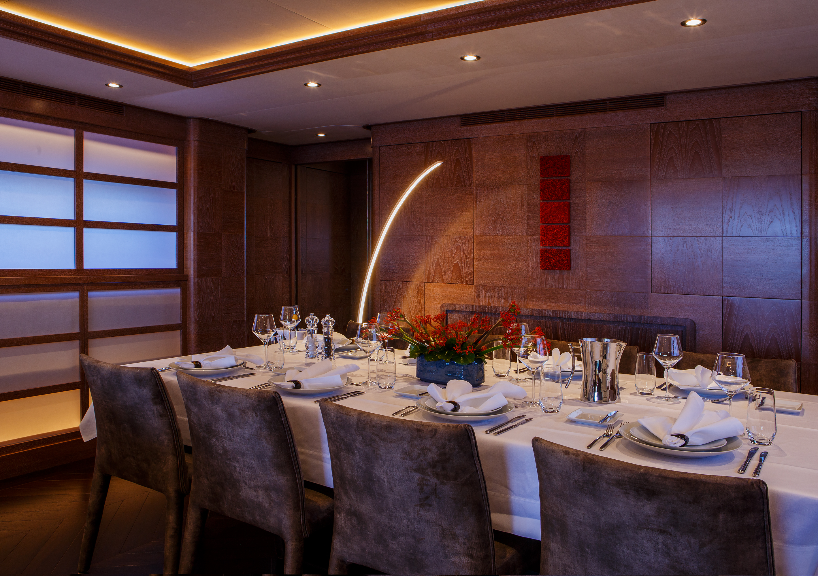 Alfresco dining can be enjoyed forward of the living area, where there is a dining area with seating for all eight guests. This spacious relaxation area is completed with an open-air barbecue and bar.