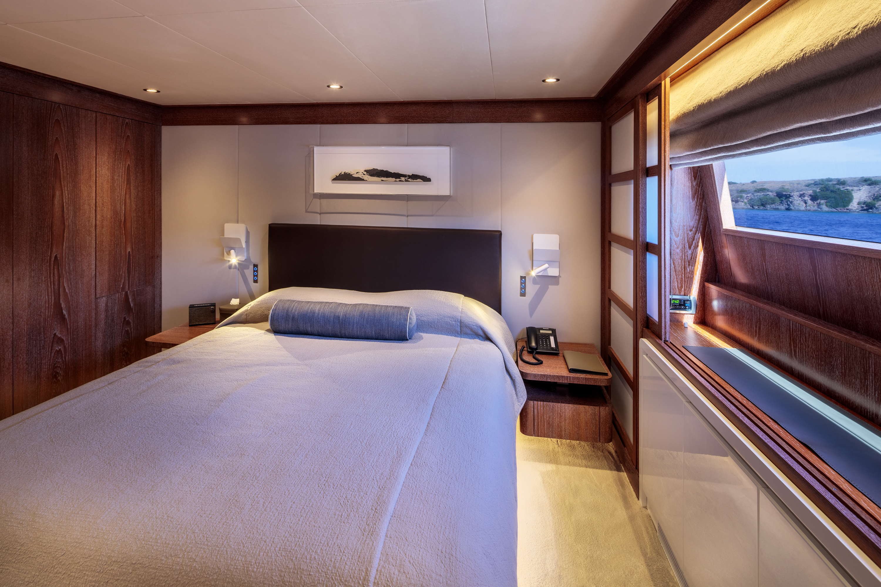 A stairwell leads down to the accommodation, which consists of a Master cabin, VIP cabin and two double cabins.