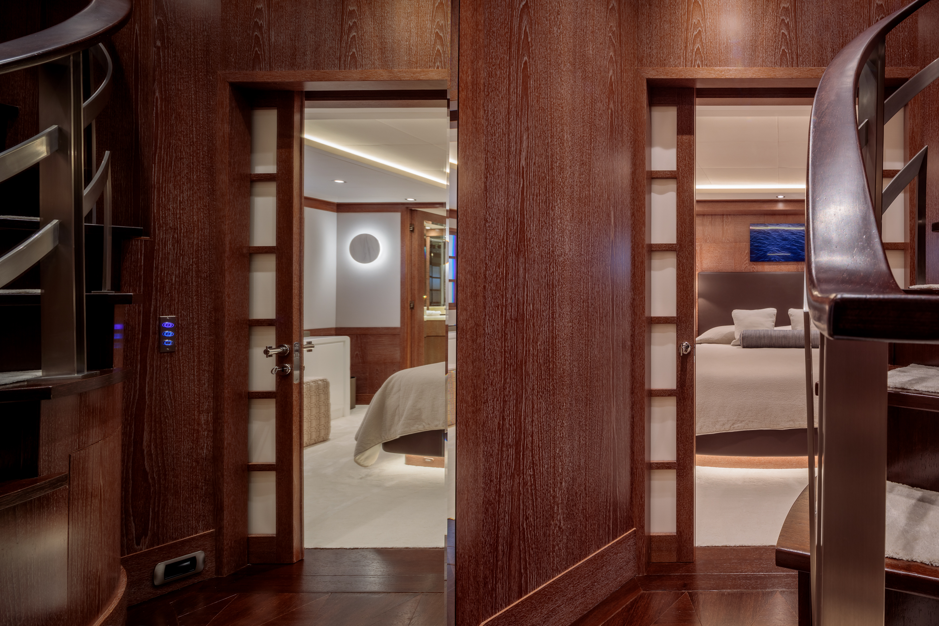 An aft swimming platform provides easy access to the ocean, with additional storage space for water toys.