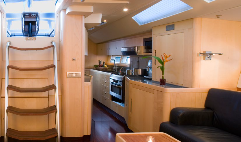 The galley and crew accommodation are behind to port, and the guest accommodation is aft to starboard of the salon.