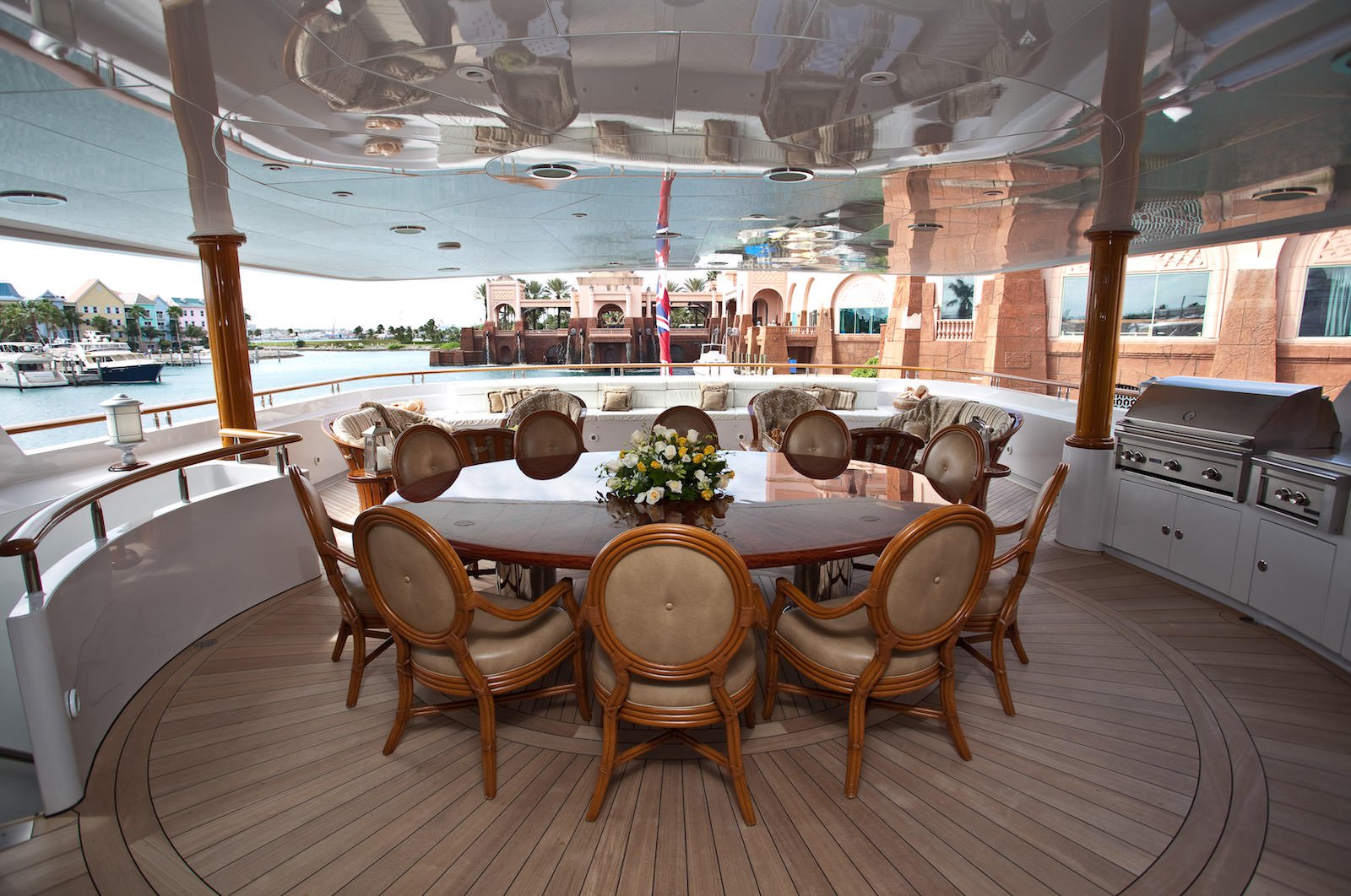 Her aft deck offers alfresco dining and seating for 12 and can be completely enclosed with windscreens if the weather is not good. The large sun deck provides ample seating and a Spa Pool spa pool with an awning.