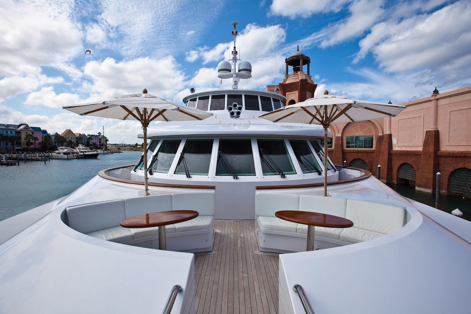 Her aft deck offers alfresco dining and seating for 12 and can be completely enclosed with windscreens if the weather is not good. The large sun deck provides ample seating and a Spa Pool spa pool with an awning.