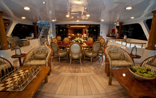 Her aft deck offers alfresco dining and seating for 12 and can be completely enclosed with windscreens if the weather is not good. The large sun deck provides ample seating and a Spa Pool spa pool with an awning.