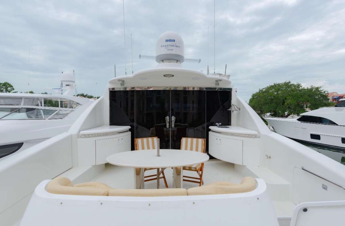 At night, the spotlights give plenty of illumination and enhance the ambiance of any special occasion. The main salon is aft of the dining area and is laid out with a chaise-lounger to port with a coffee table and armchairs.
