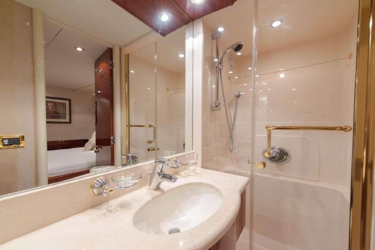 The main salon is aft of the dining area and is laid out with a chaise-lounger to port with a coffee table and armchairs. The starboard side of the room has a stairway up to the raised pilothouse and a stairway down to the guest ...