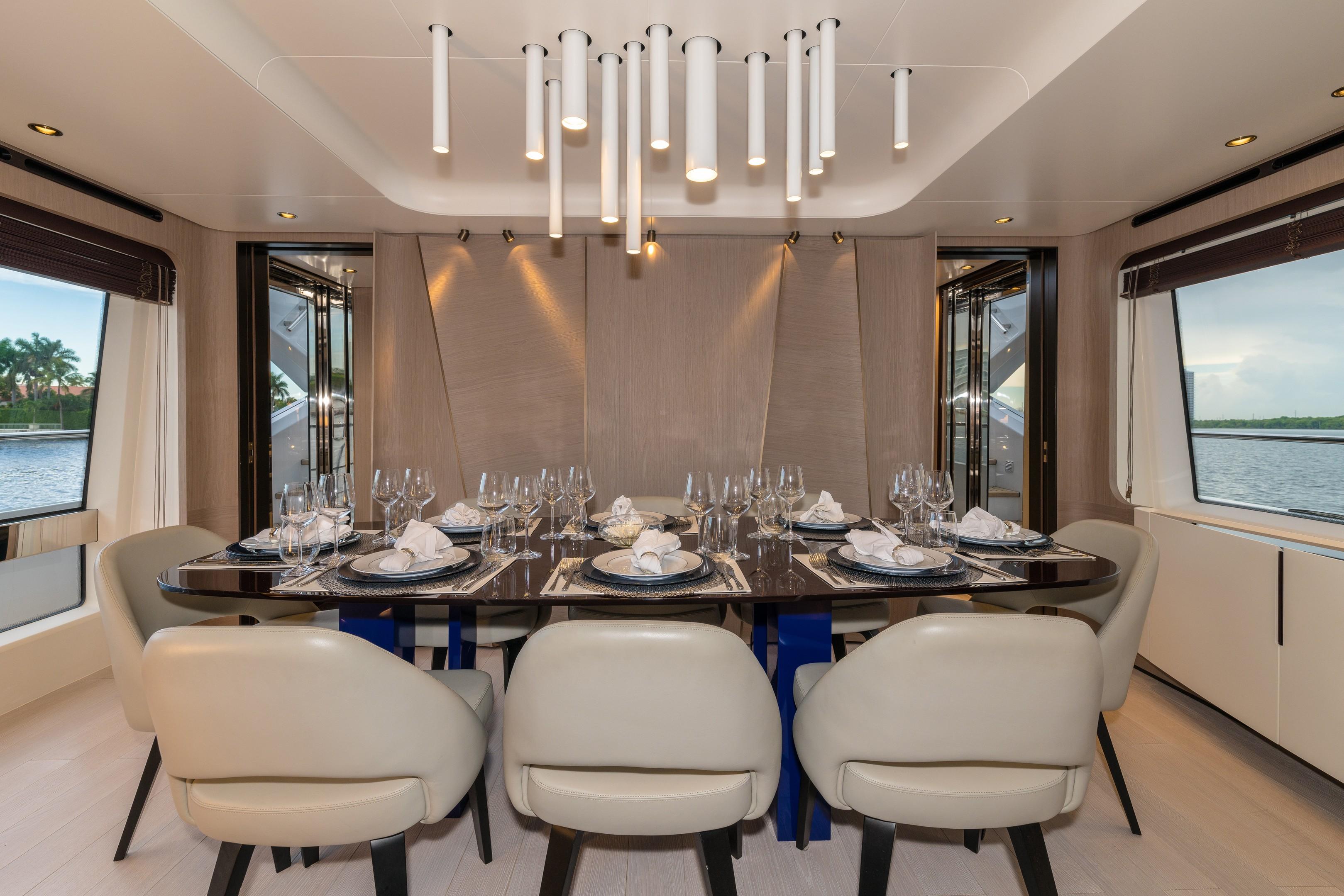 The formal dining area behind seats eight guests around an elegant contemporary setting, with an almost full-height window to port. The main salon consists of three sofas around a coffee table to port, while to starboard two armchairs and a side table make a place for confidential conversation away from the main group.