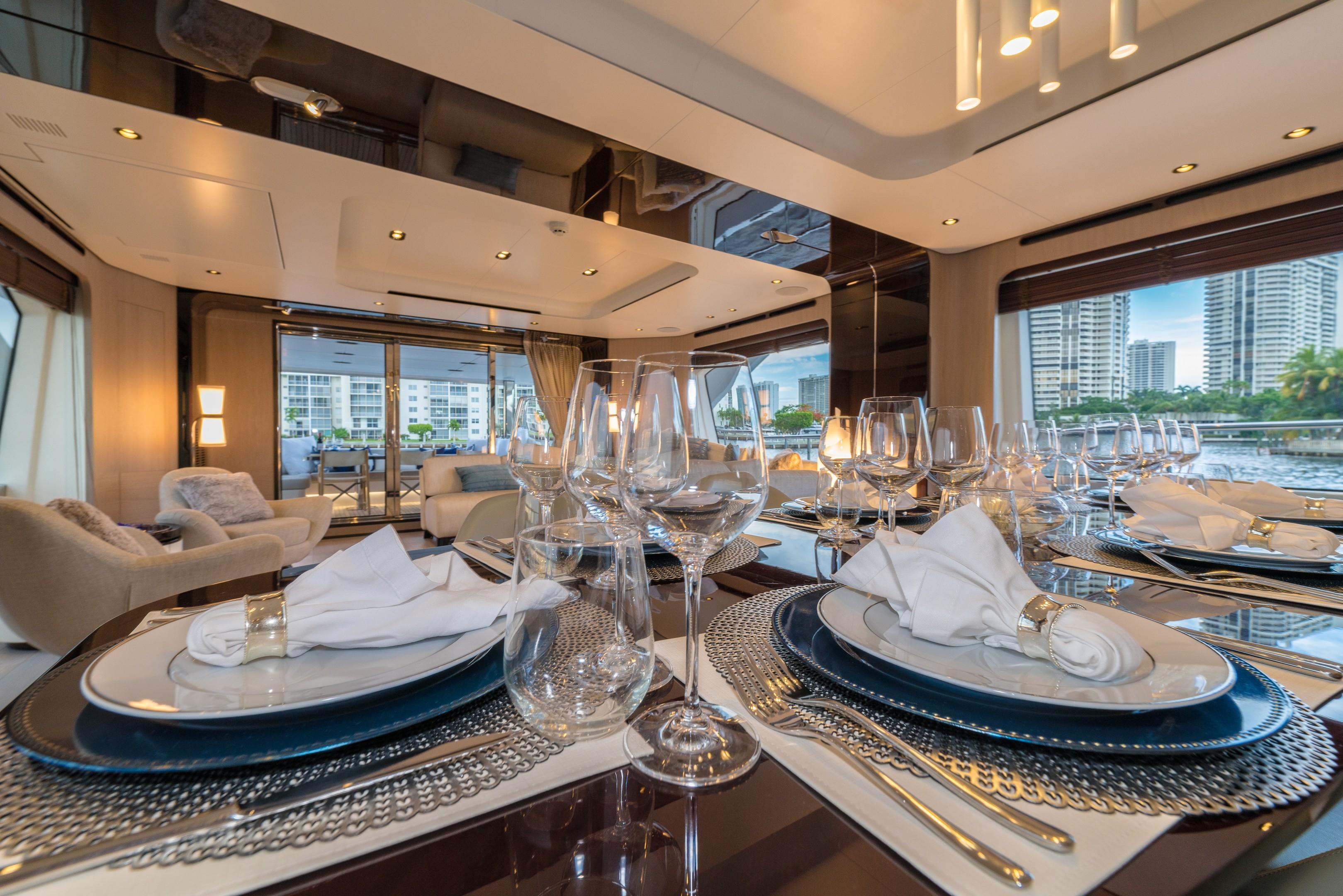 The formal dining area behind seats eight guests around an elegant contemporary setting, with an almost full-height window to port. The main salon consists of three sofas around a coffee table to port, while to starboard two armchairs and a side table make a place for confidential conversation away from the main group.