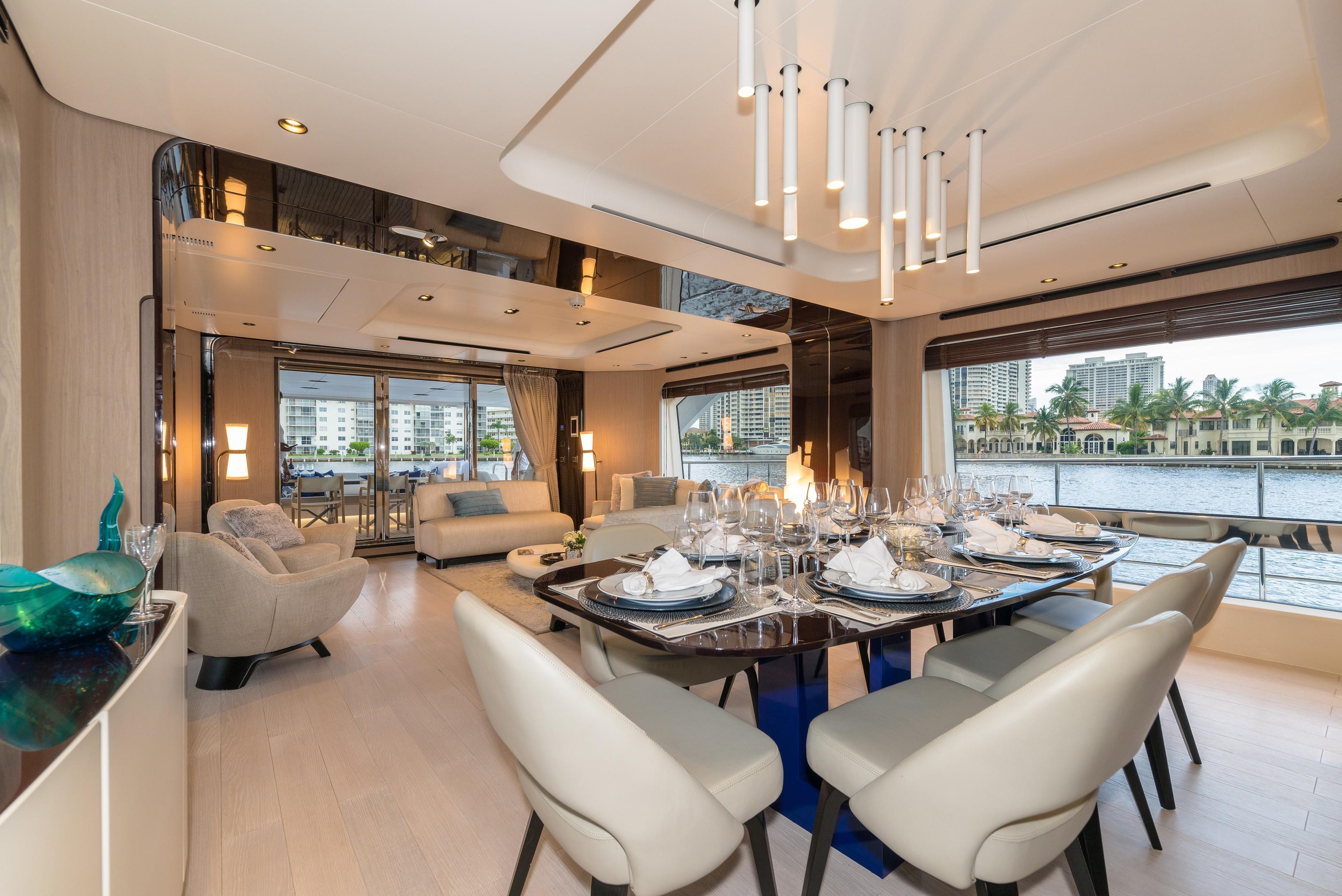 The formal dining area behind seats eight guests around an elegant contemporary setting, with an almost full-height window to port. The main salon consists of three sofas around a coffee table to port, while to starboard two armchairs and a side table make a place for confidential conversation away from the main group.
