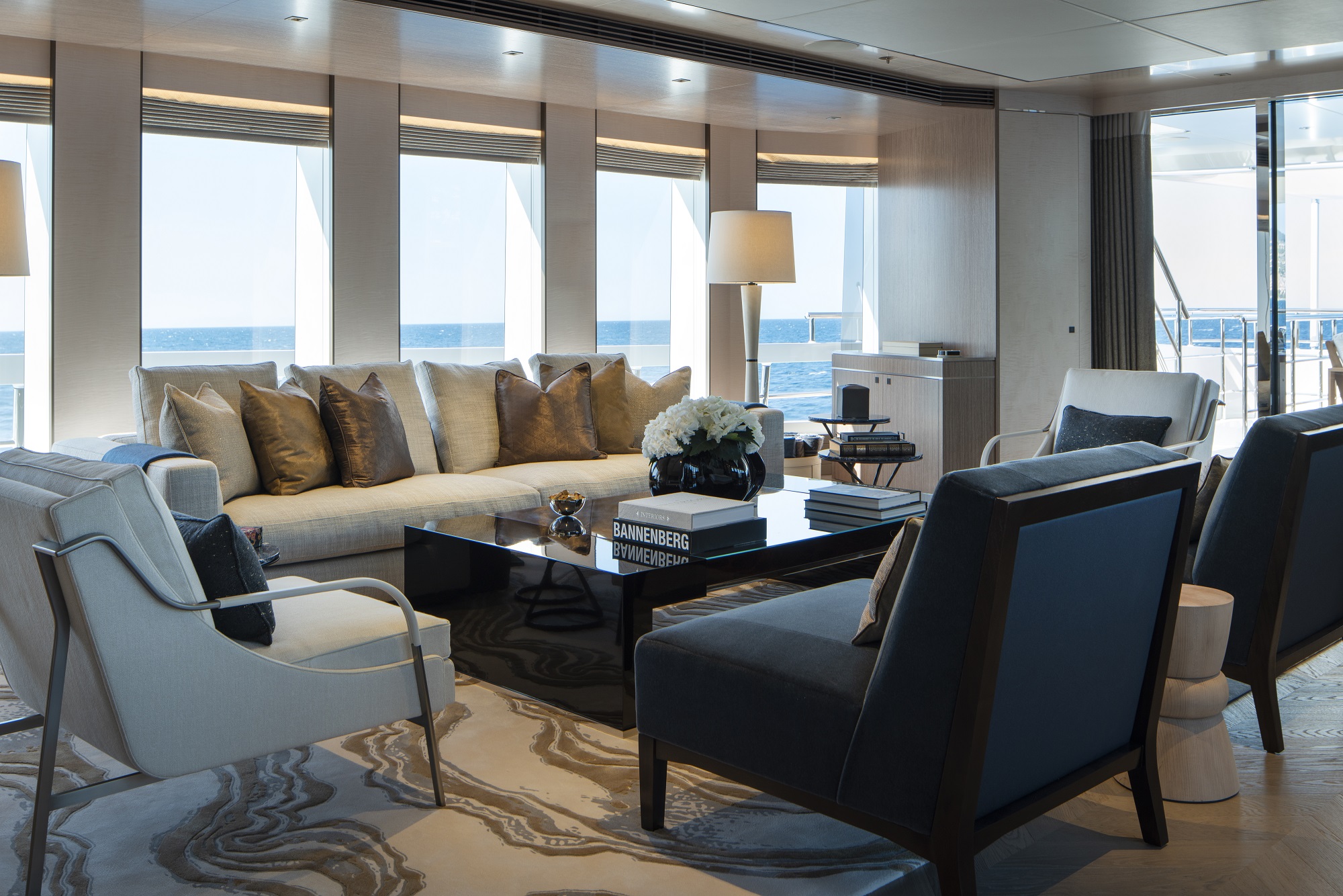 On the main deck, the Master suite is forward with the galley and main foyer behind, both of which lead through to the formal dining area combined with the main salon.