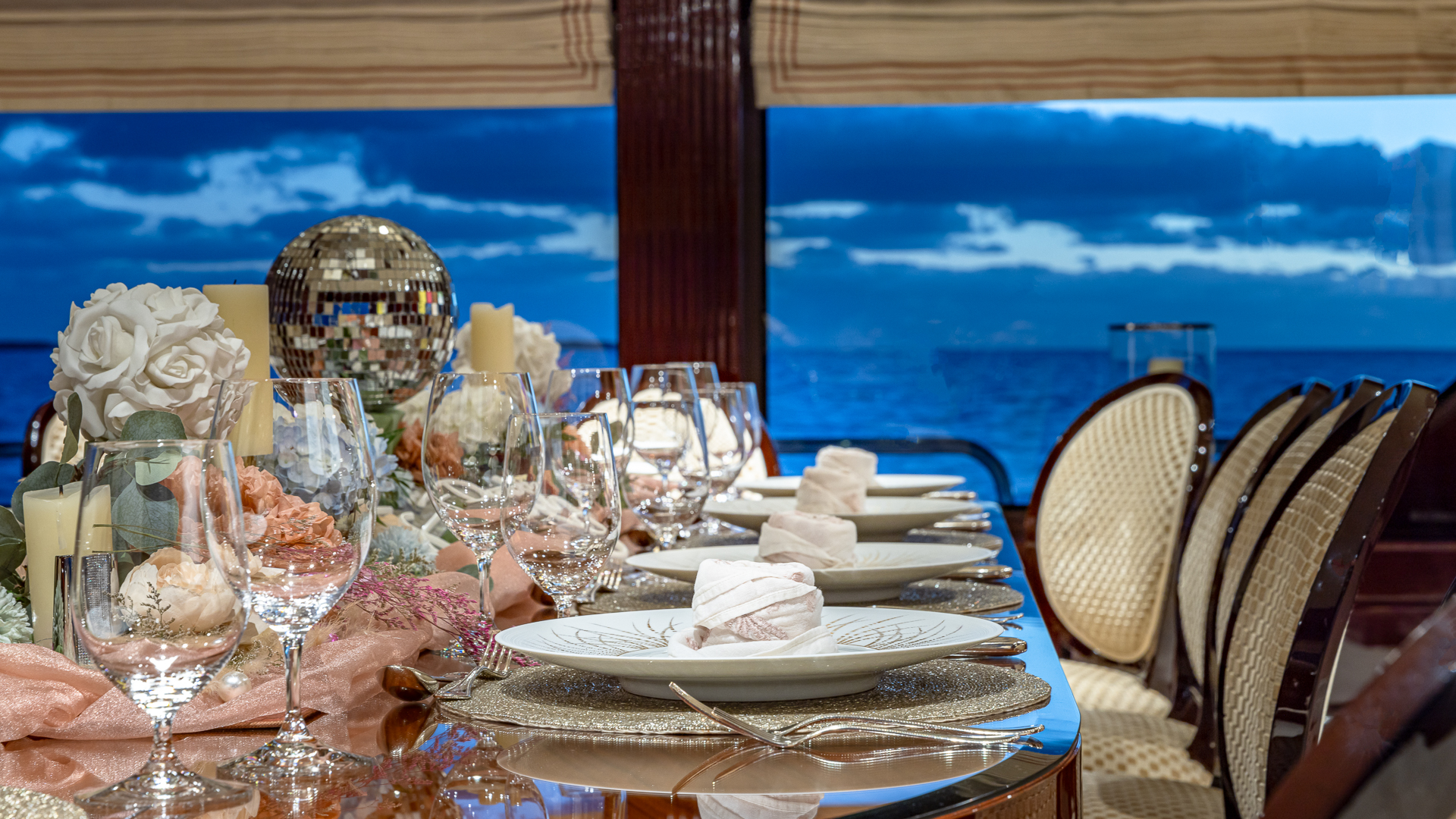 She has numerous areas throughout the vessel to entertain, dine and relax while her professional and friendly staff takes care of your every whim.