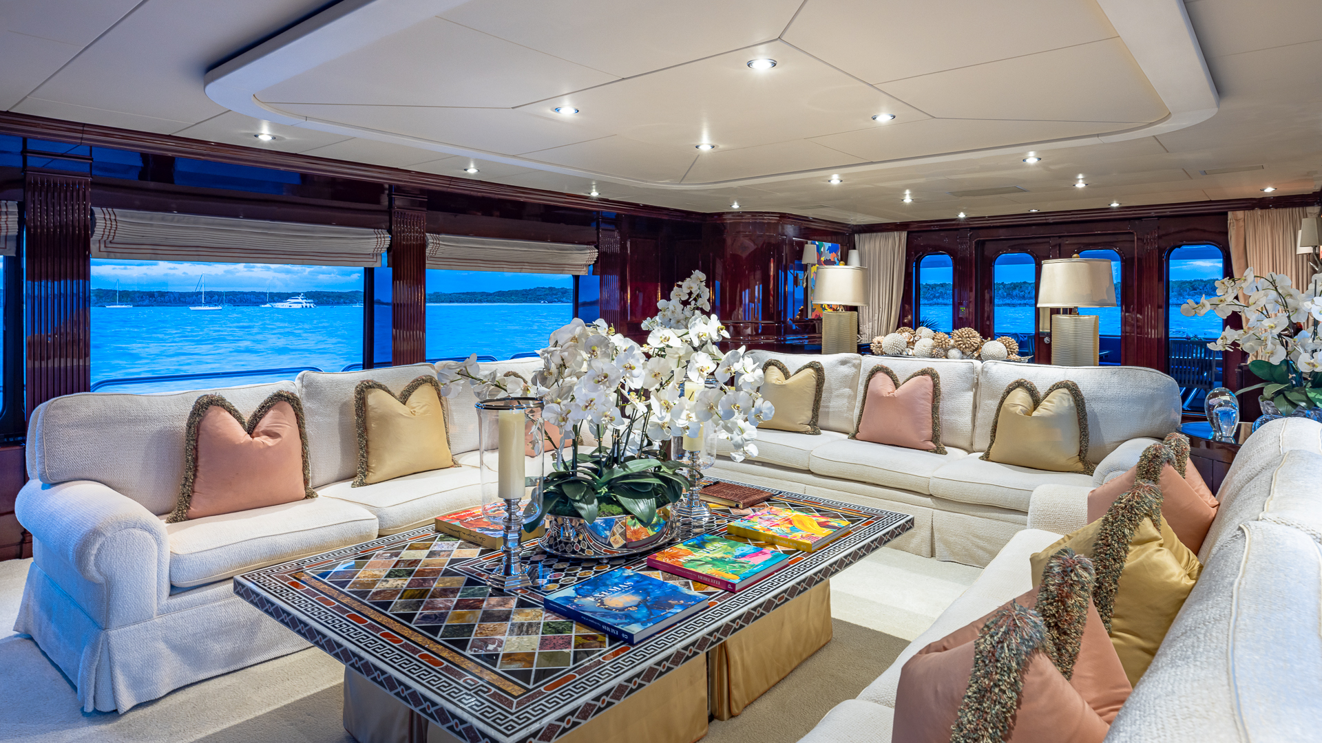 The SKYLOUNGE is a most welcoming area with L-shaped sofa and two tables to port with a 75” 4K TV.
