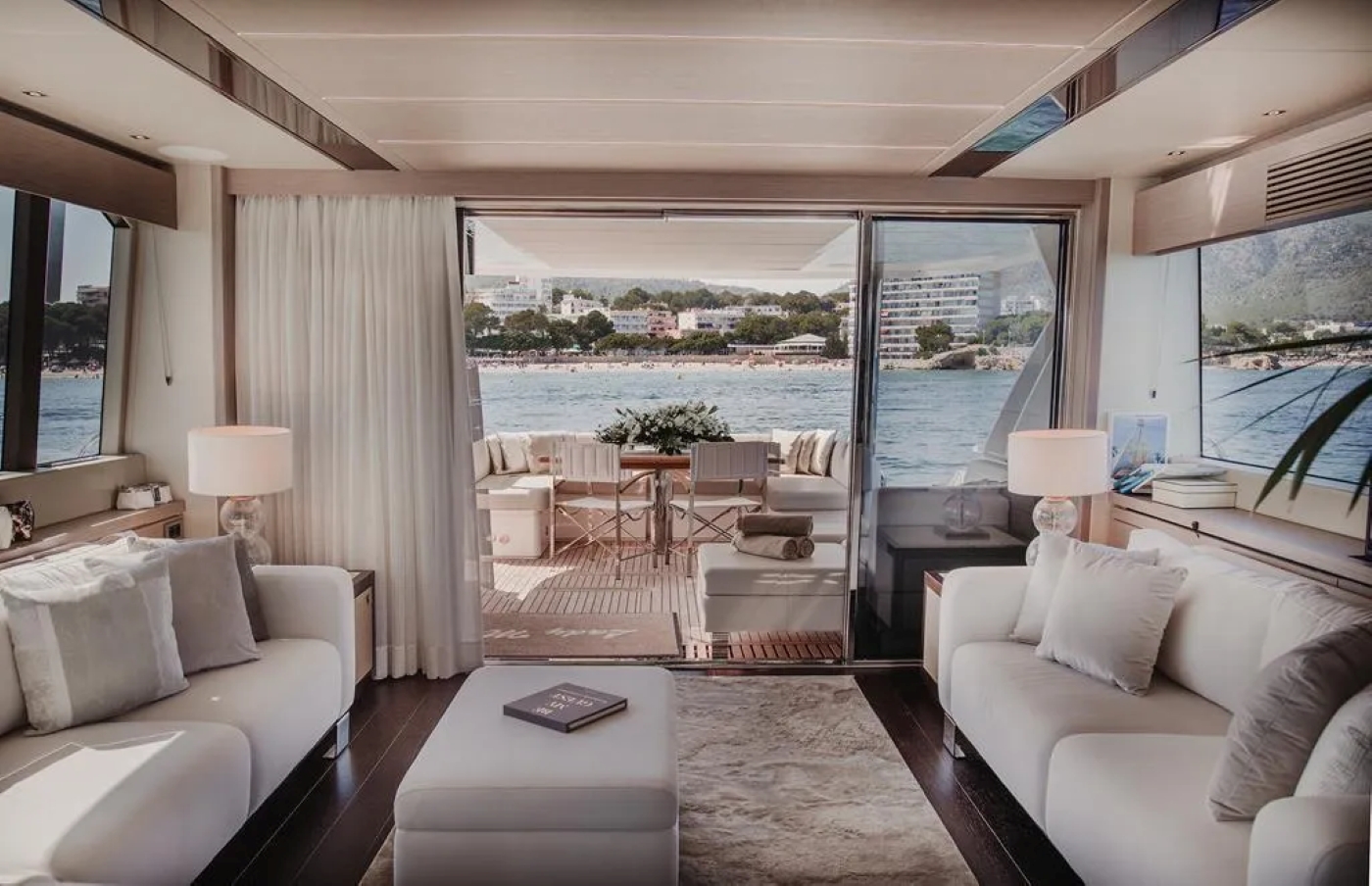The dining seating continues around and curves another sofa/sunbed lining the forward and port corners, with the flybridge controls starboard.