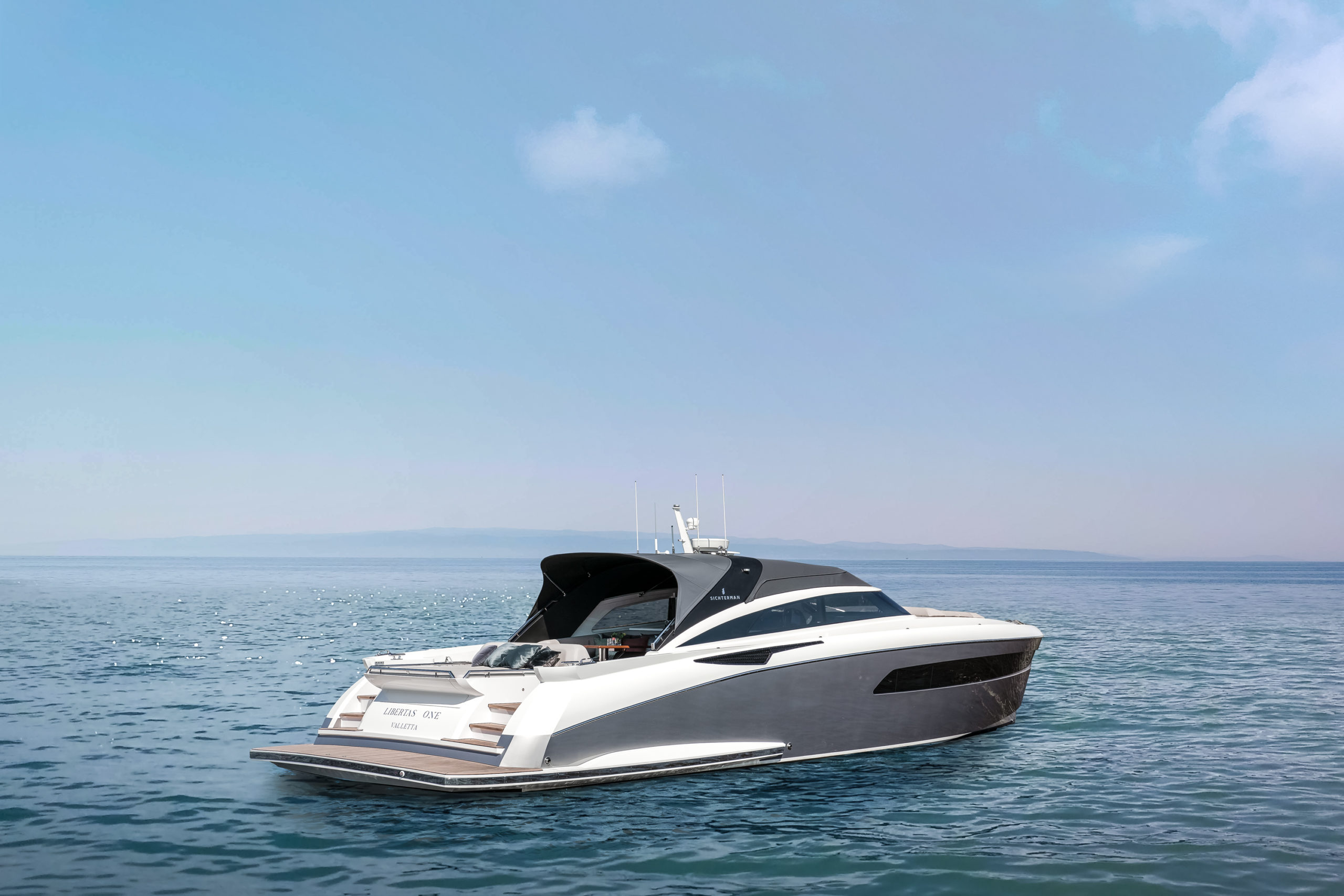 Motor yacht LIBERTAS ONE measures 	16.42m (53'87'') and was built by the Sichterman shipyard in 2020. She was designed by Cor D. Rover and features modern, sporty exterior lines with deluxe interiors.